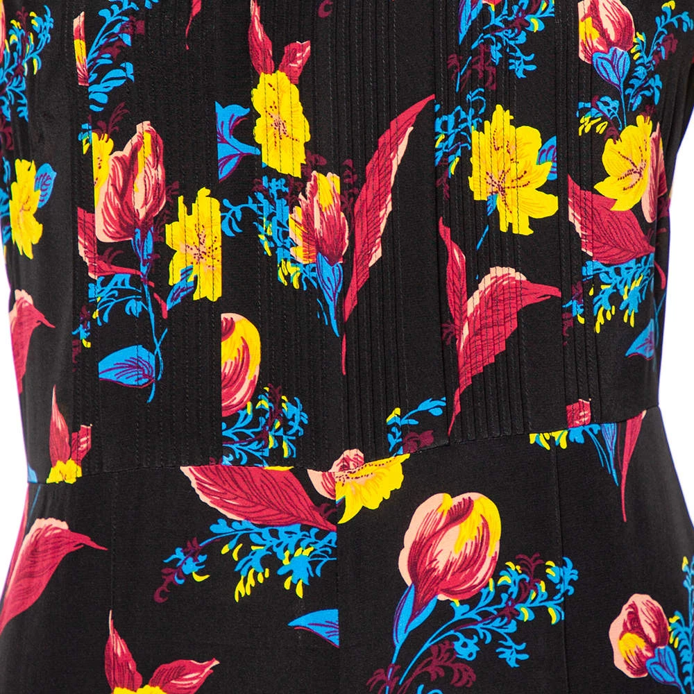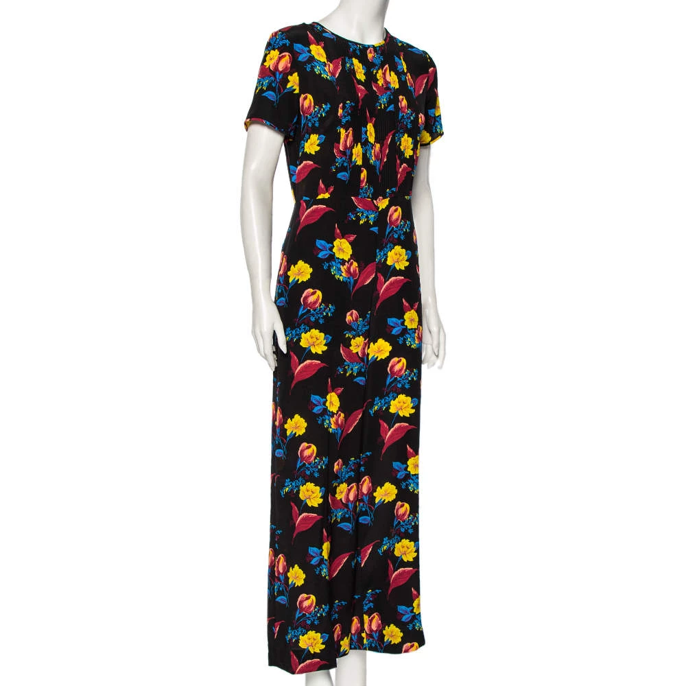 This jumpsuit from Diane von Furstenberg is here to add a pop of color and refreshment to your collection. This jumpsuit features a beautiful black floral-printed silk fabric with pintuck details and short sleeves completing its shape. Chic and comfortable, this piece will keep your style on point all day.