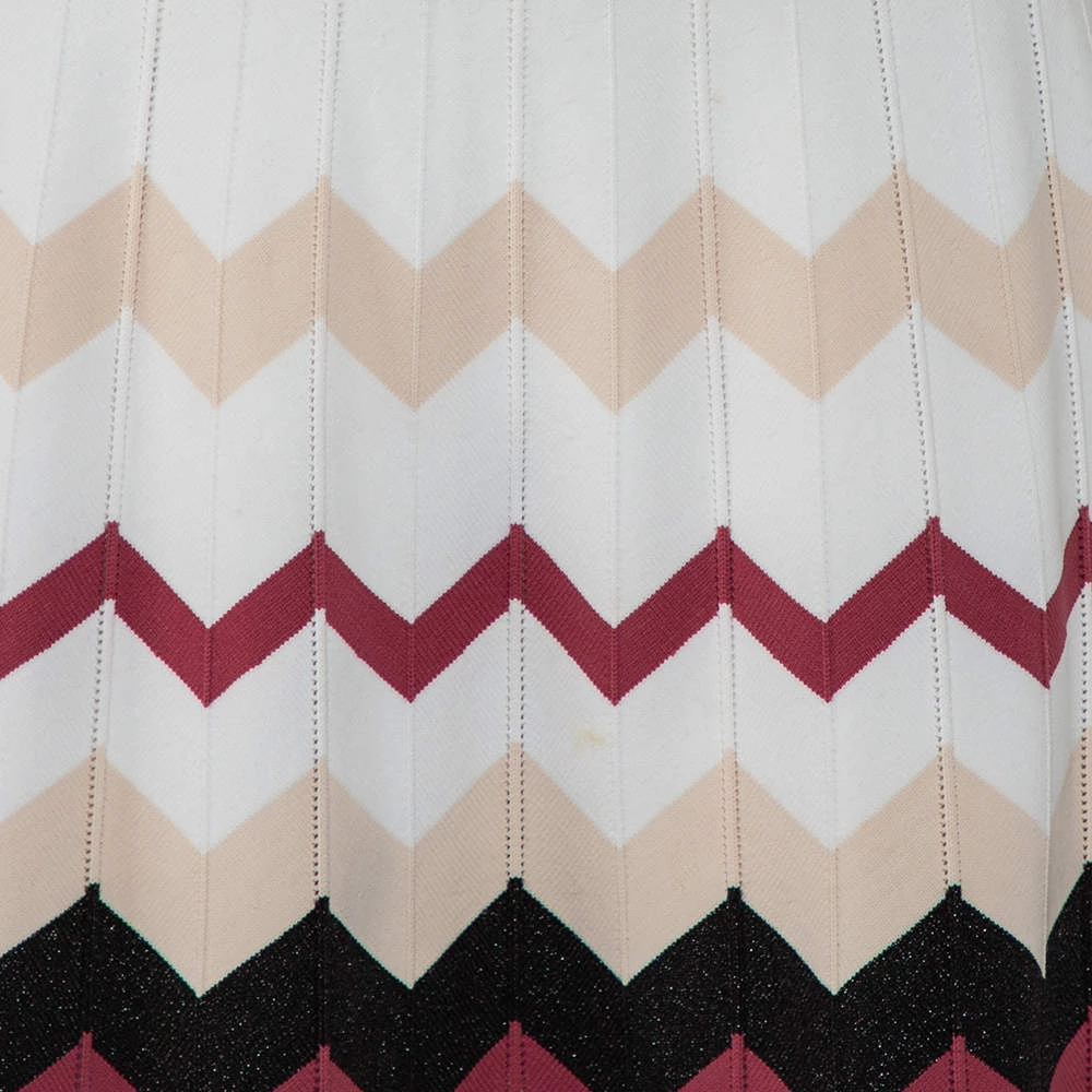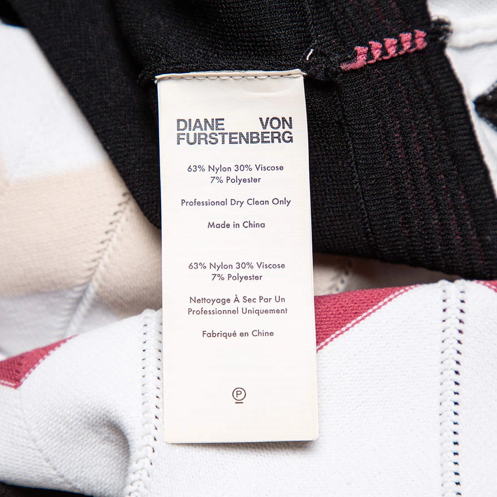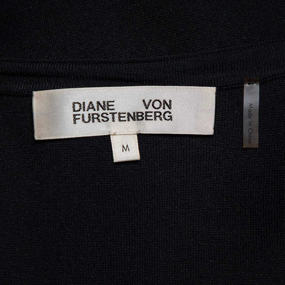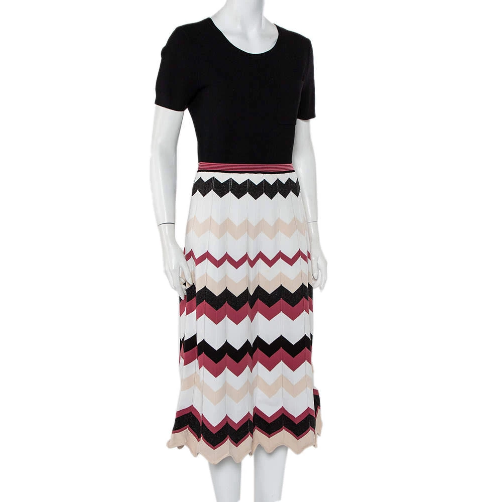 This Diane Von Furstenberg dress is a masterpiece that delivers elegance in spades. Crafted from a knit material, this midi dress in black is a must-have. It has been styled with a chevron pattern on the pleated skirt, short sleeves and a scoop neckline.