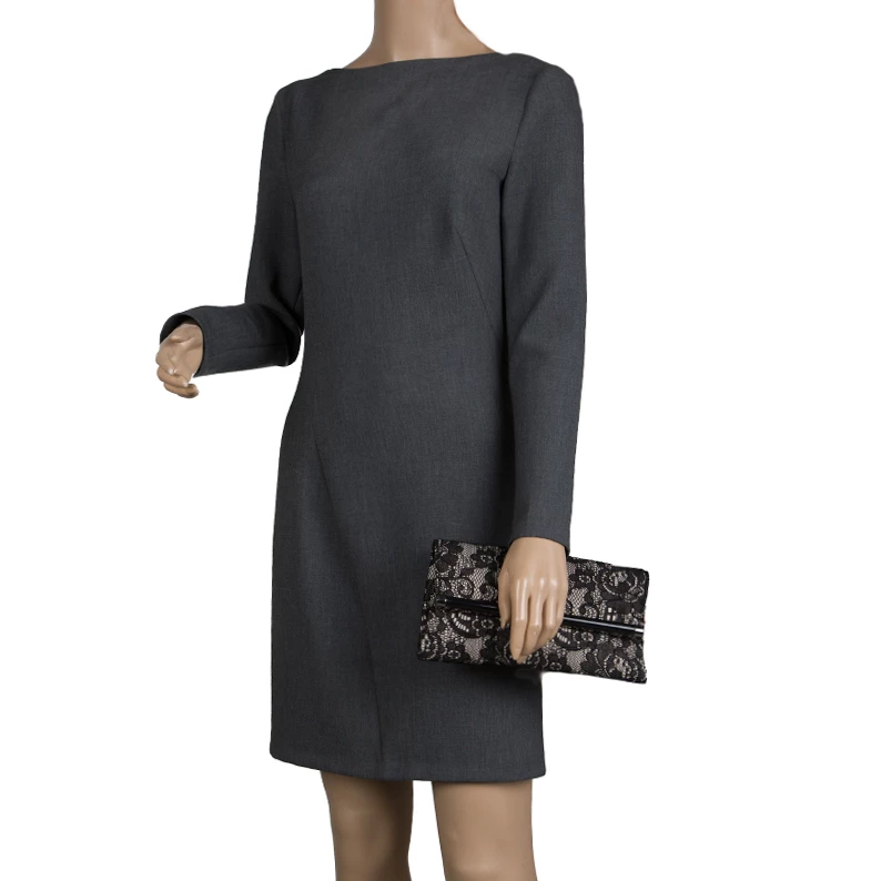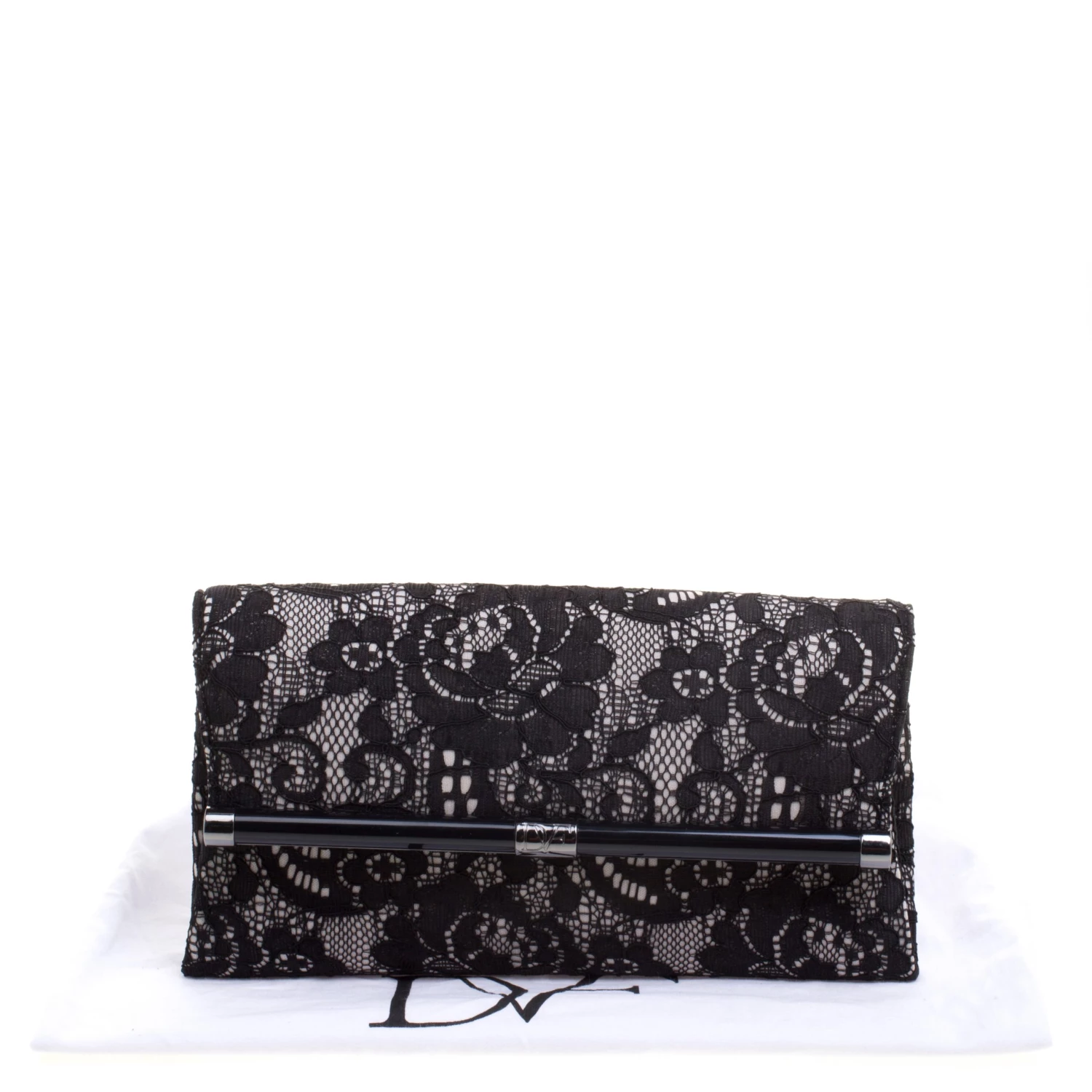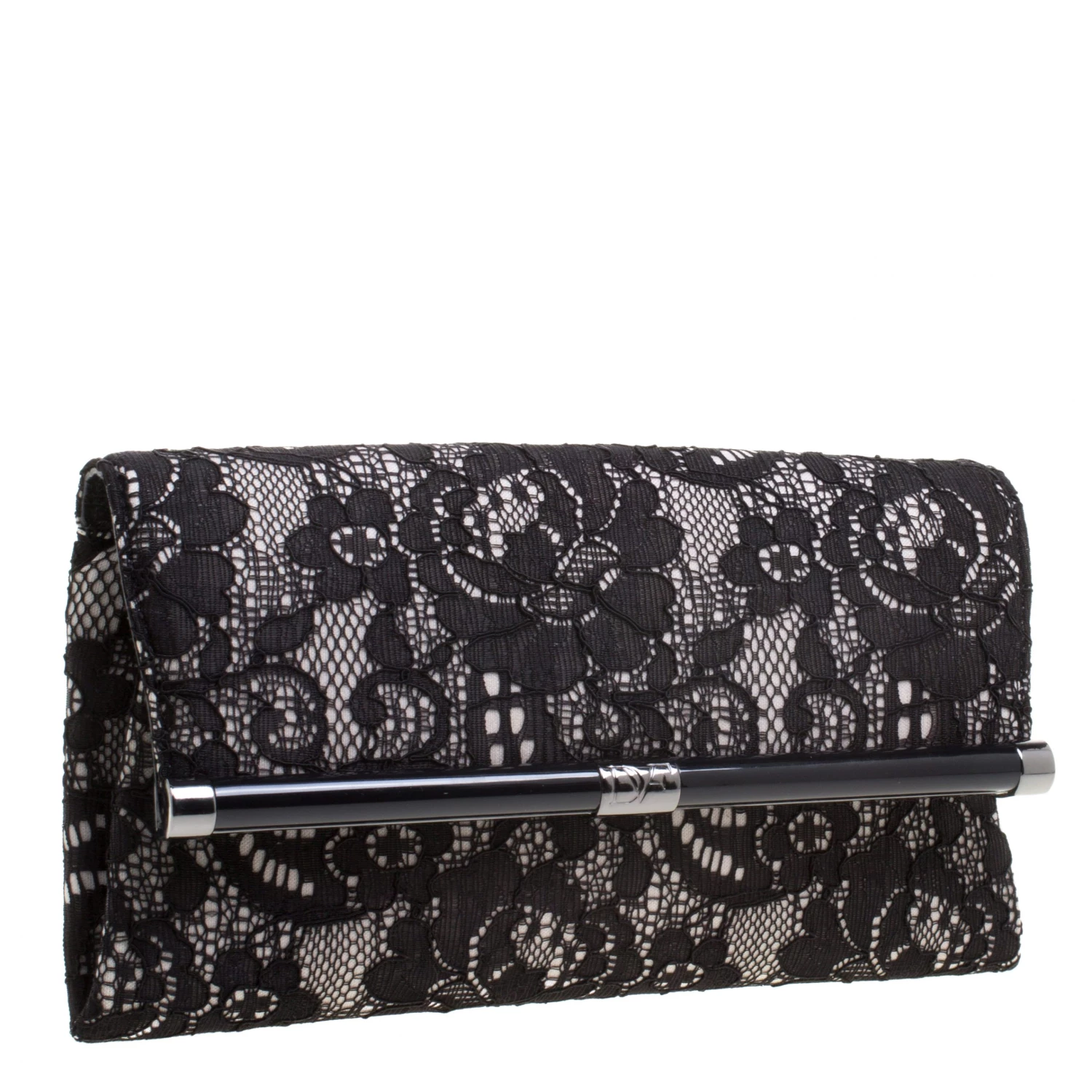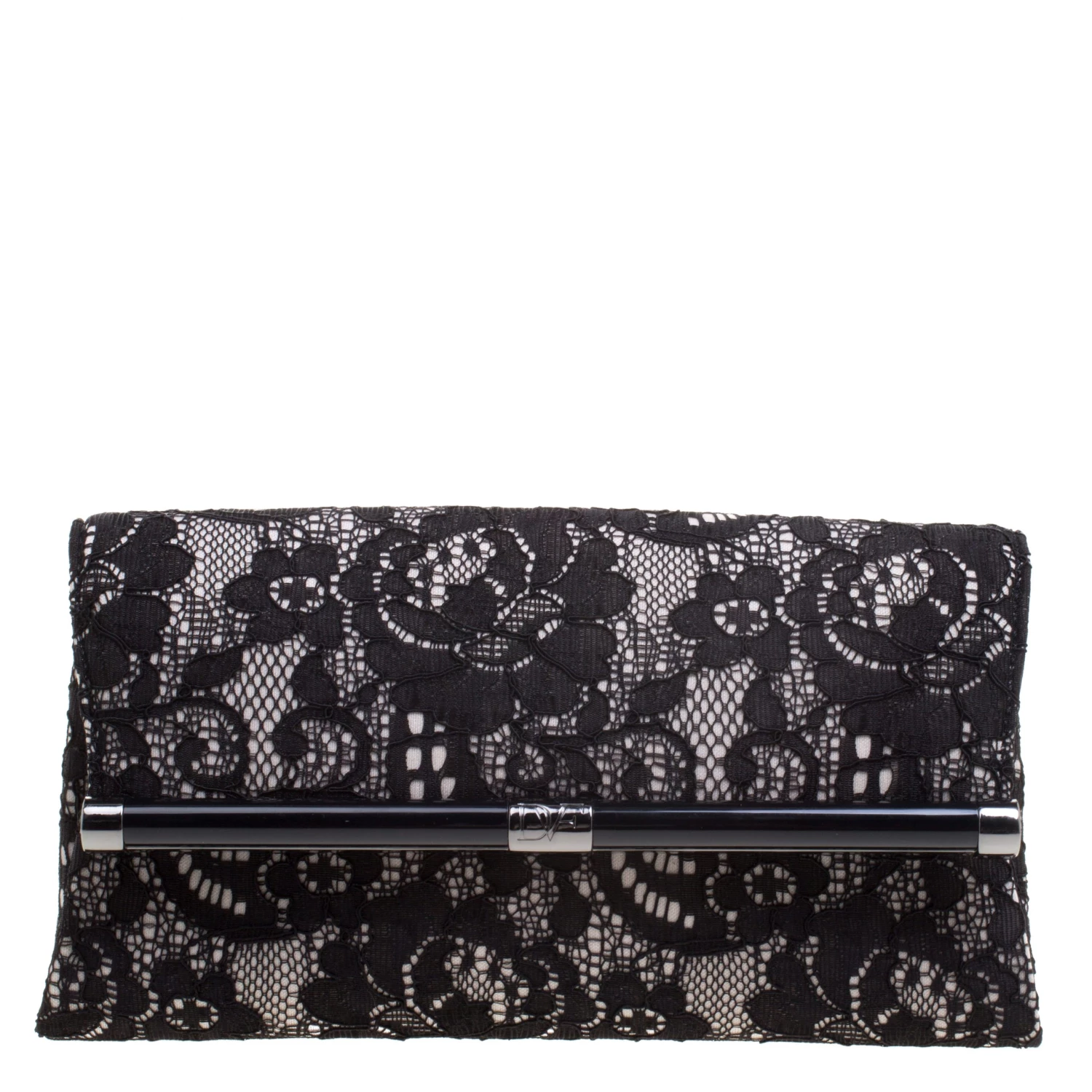 This classy envelope clutch by Diane Von Furstenberg has a lace exterior. The black clutch has a spacious interior that is fabric lined and houses a zip pocket. Flaunt this piece with your gowns and dresses.