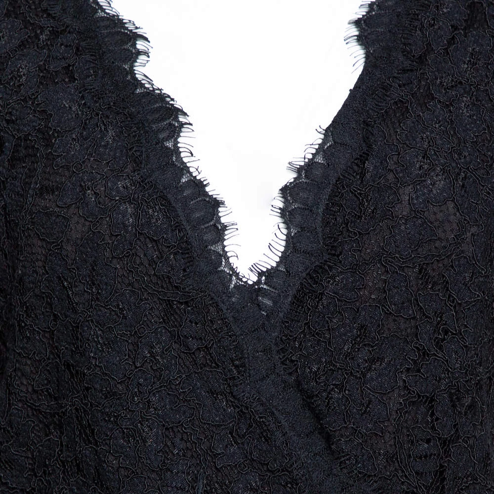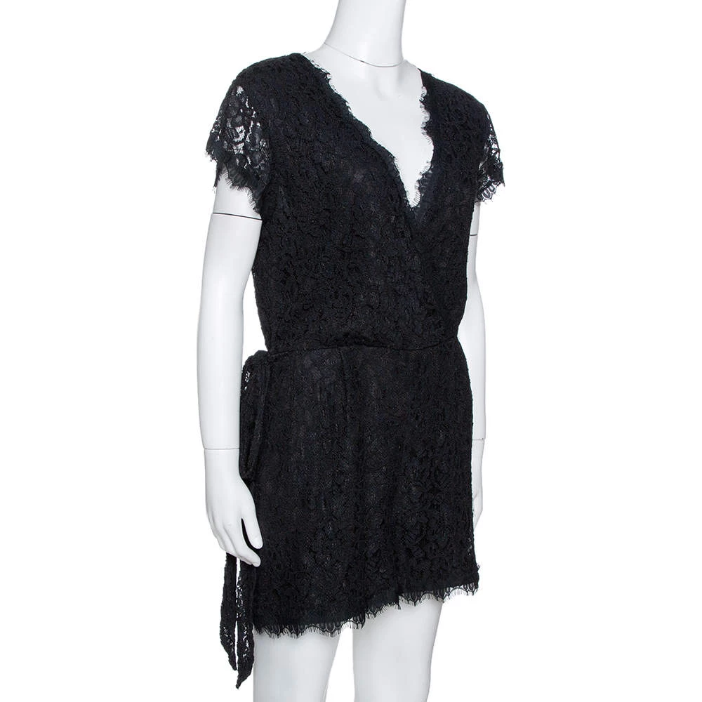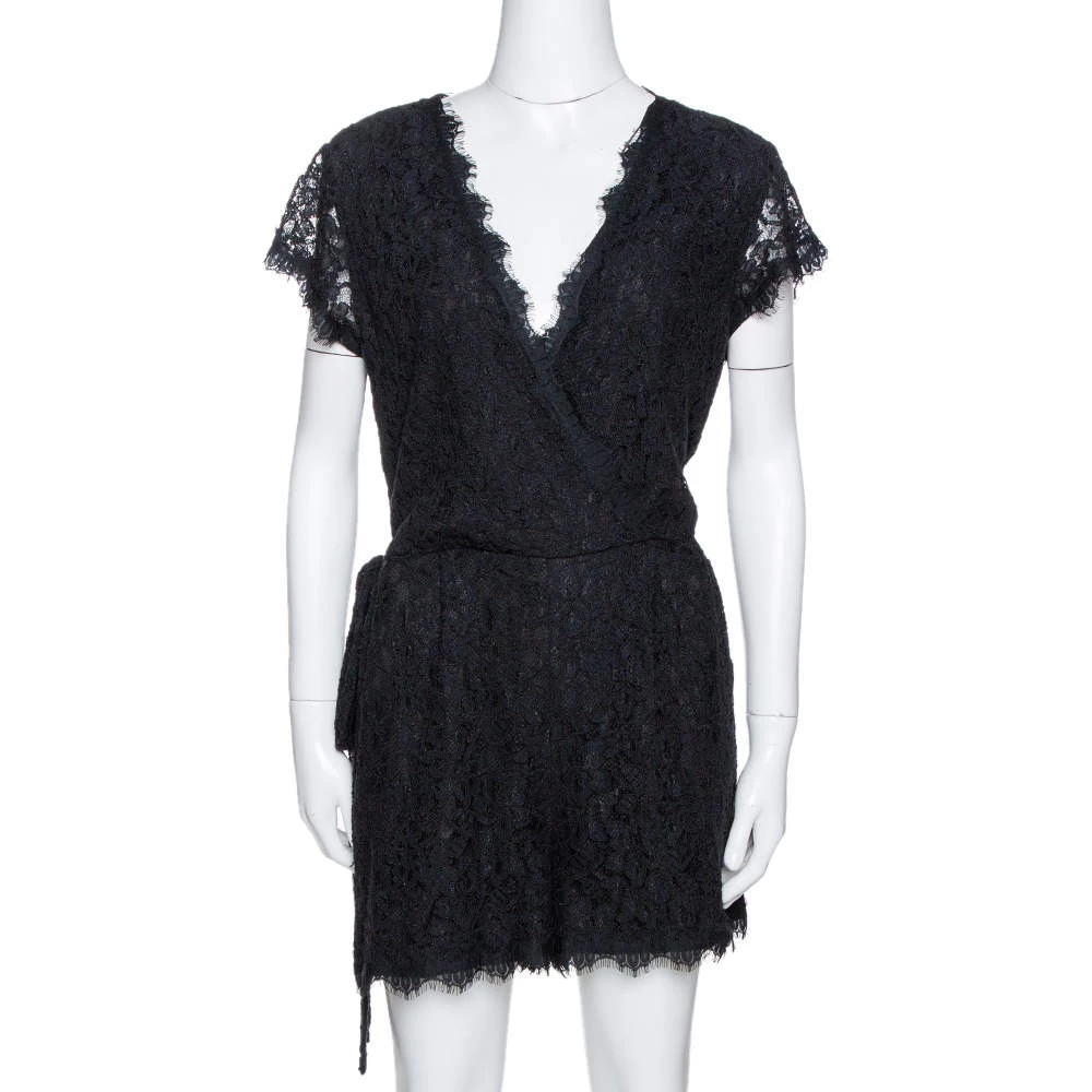 Creations from DVF are made for women who like to experiment with different styles and this romper proves to be an impressive piece. It features a black lace construction that is enhanced by a deep V-neckline, cap sleeves, and a self-tie belt at the waist. Pair it with pointed stilettoes for a refined and classy look.