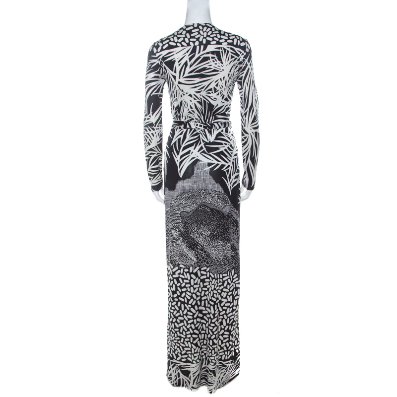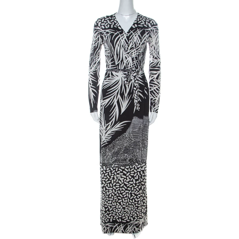 Diane von Furstenberg refreshes her signature wrap design with a monochromatic mix of contemporary palm prints. The wrap neckline and a self-tie belt will visually balance the ultra-flattering silhouette cut from silk-jersey.