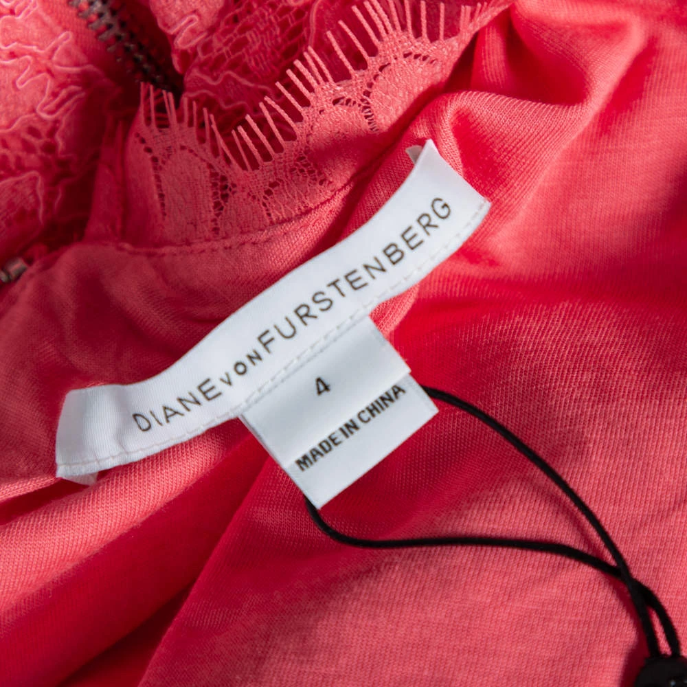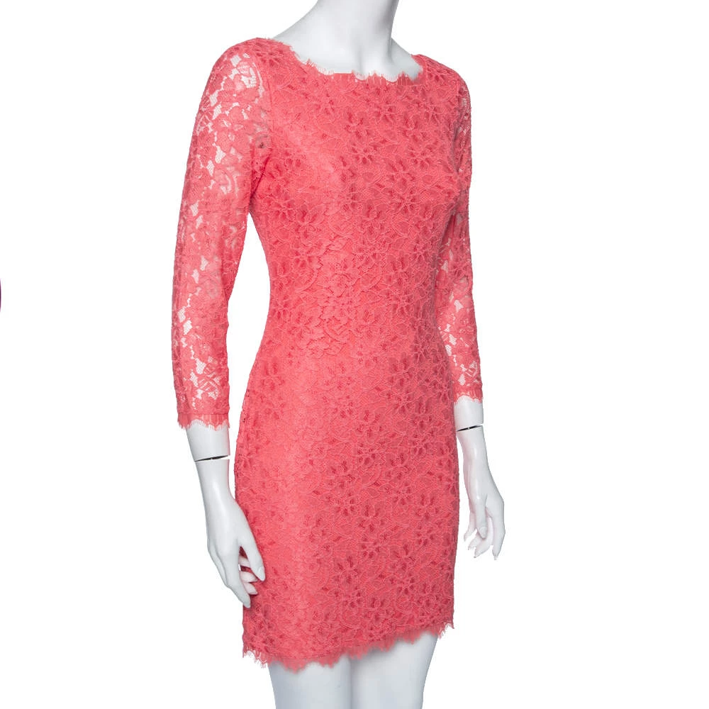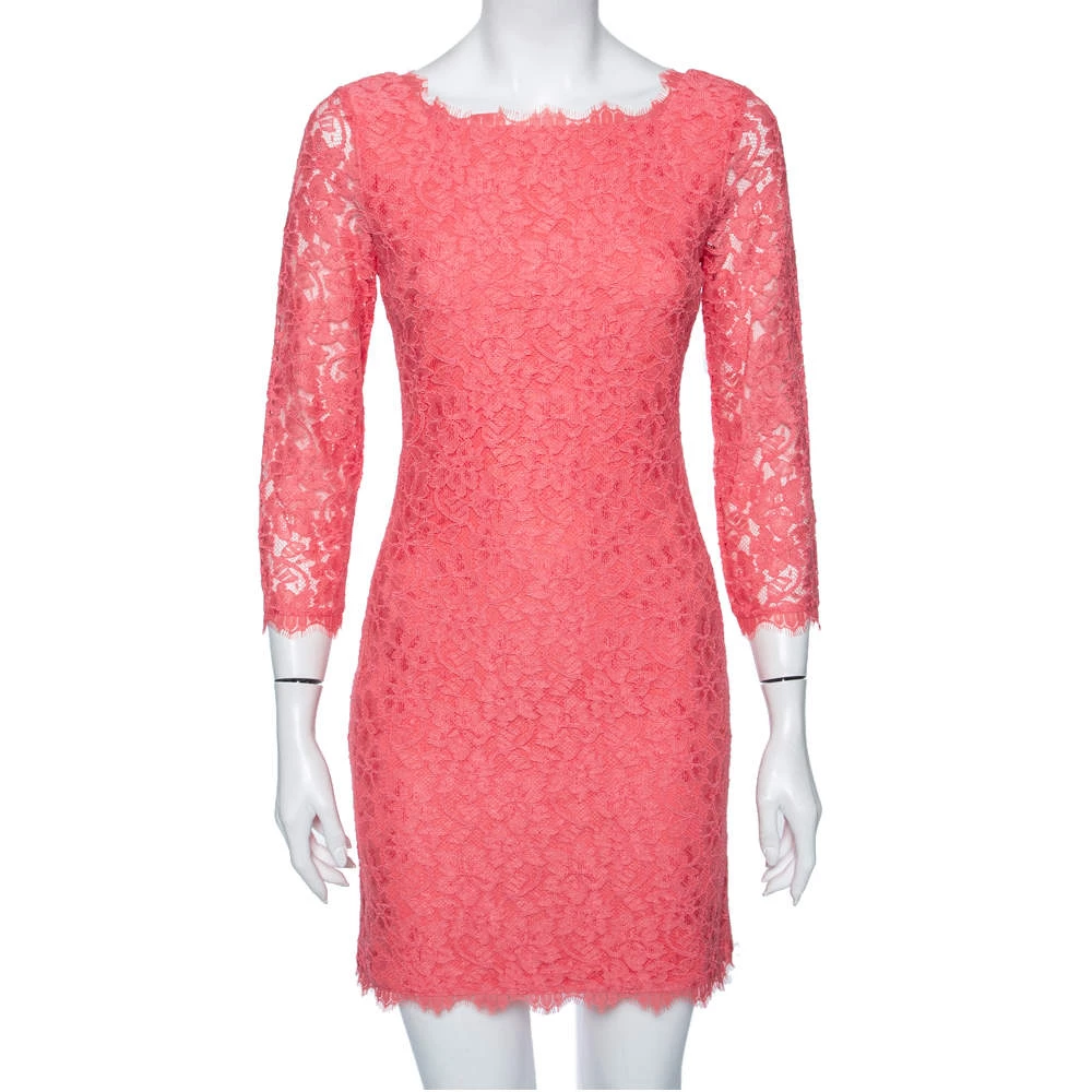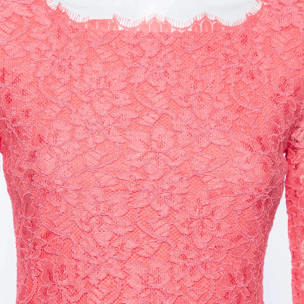 This flattering mini dress by Diane von Furstenberg is perfect for evenings. It has been crafted from bright coral lace and has a feminine exterior. It has a simple neckline, a long zip at the back, fitted silhouette and long sleeves.