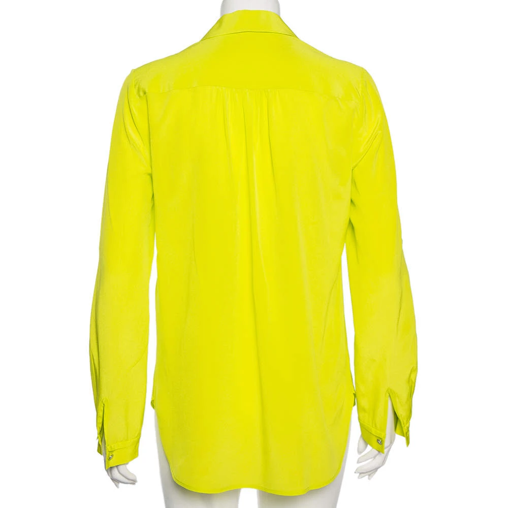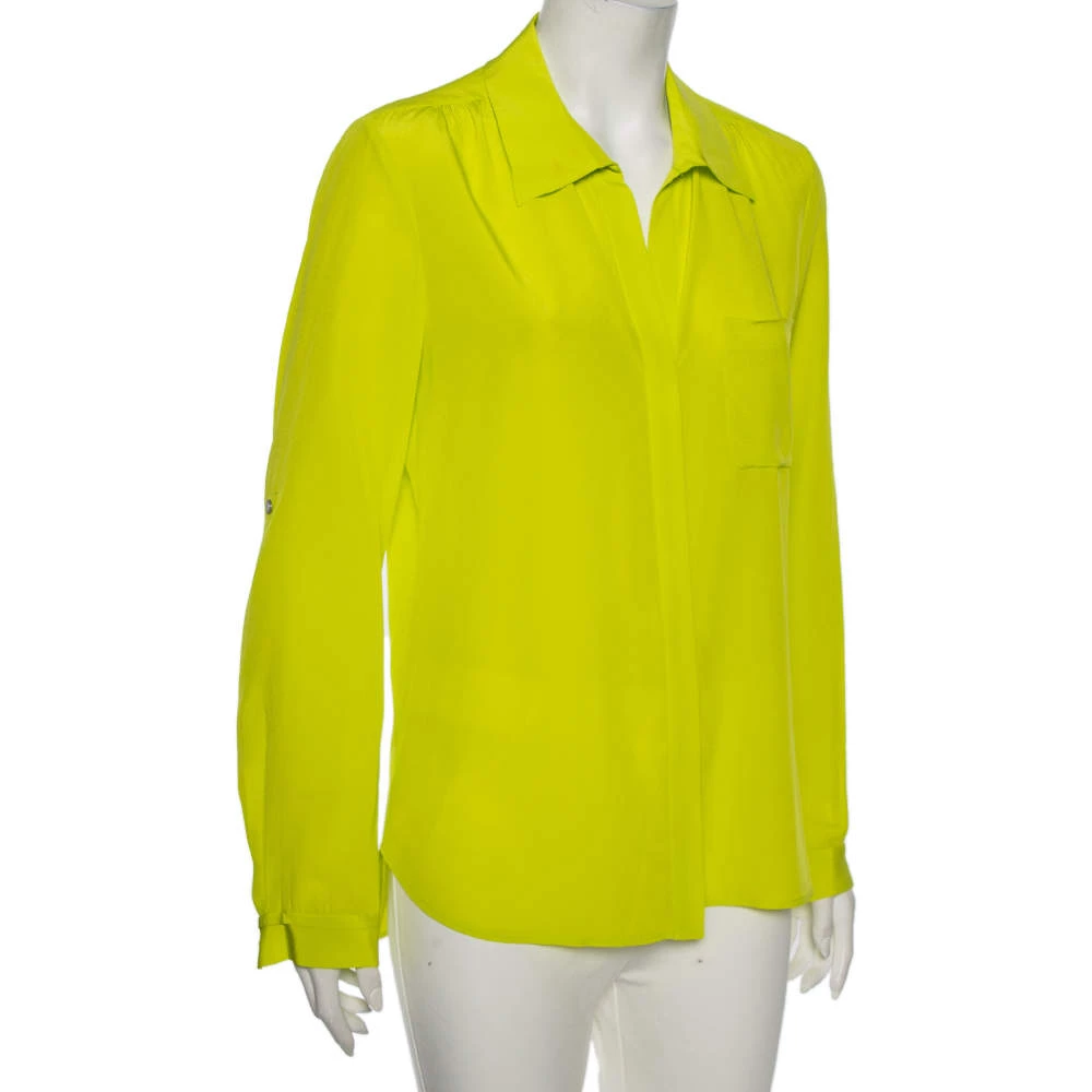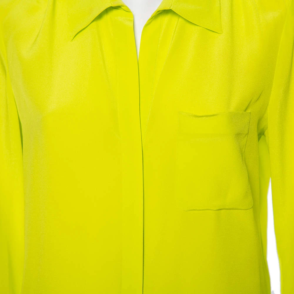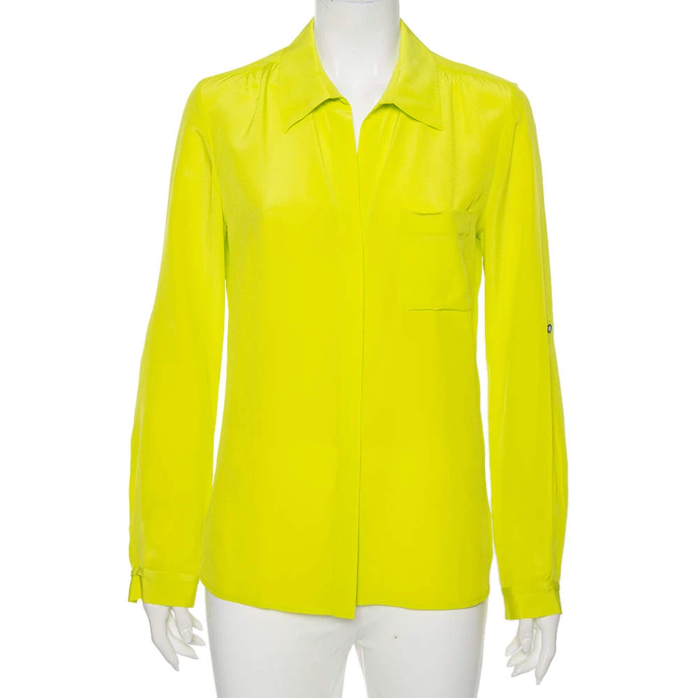 The house of Diane Von Furstenberg brings you the best of the modern trends with this impressive shirt. The primary use of bright green color in this top makes you look stylish and chic. This silk top lends opulence and charm to your look.