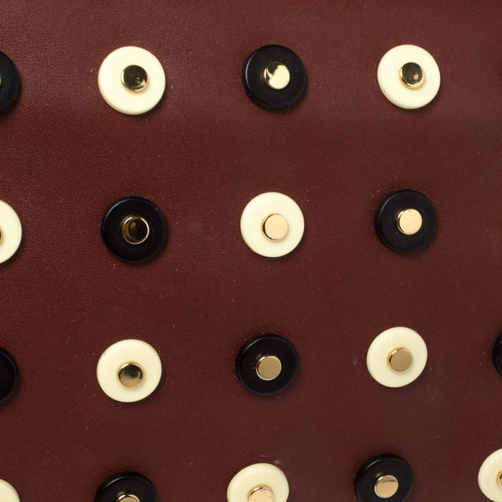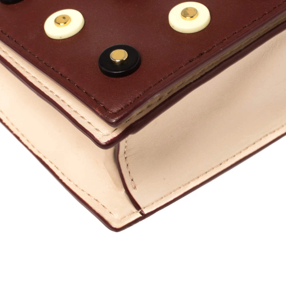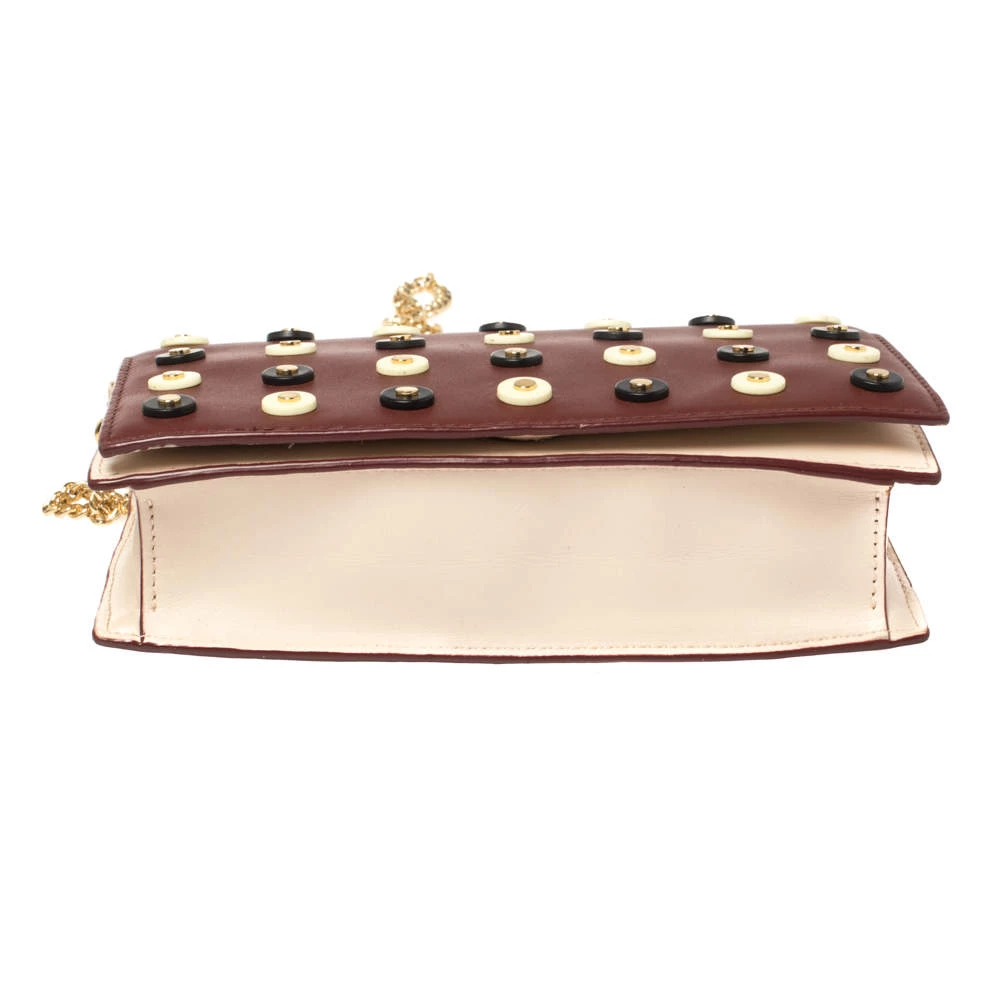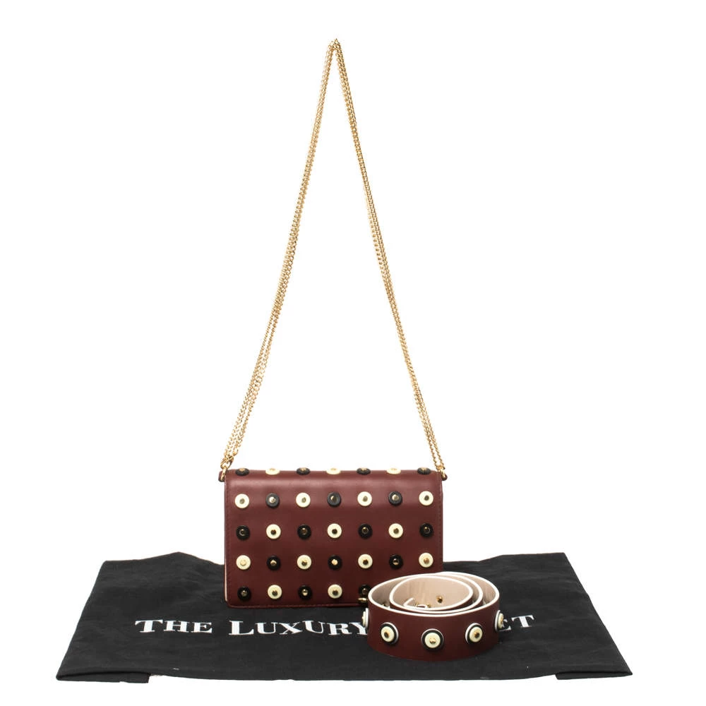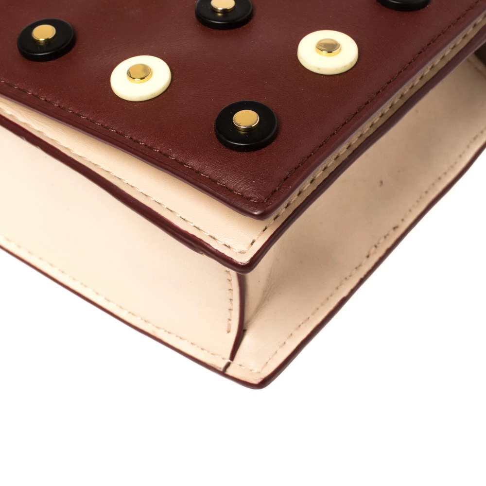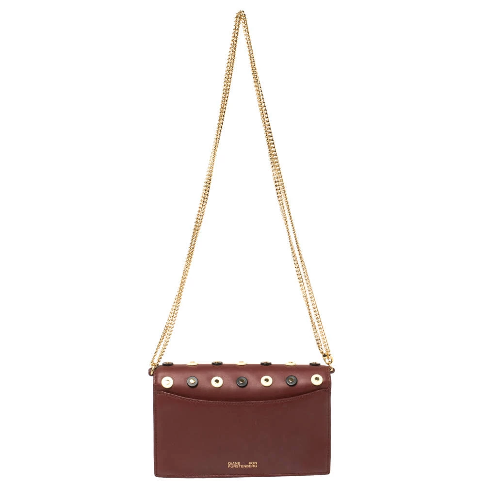 Flap bags like this DVF creation will never go out of style. Crafted from leather, this bag features a burgundy exterior and a single shoulder sling. The front flap exhibits gold-tone stud details and opens to a fabric-lined interior with enough space to keep your daily essentials. This elegant piece is a must-have in your bag collection!