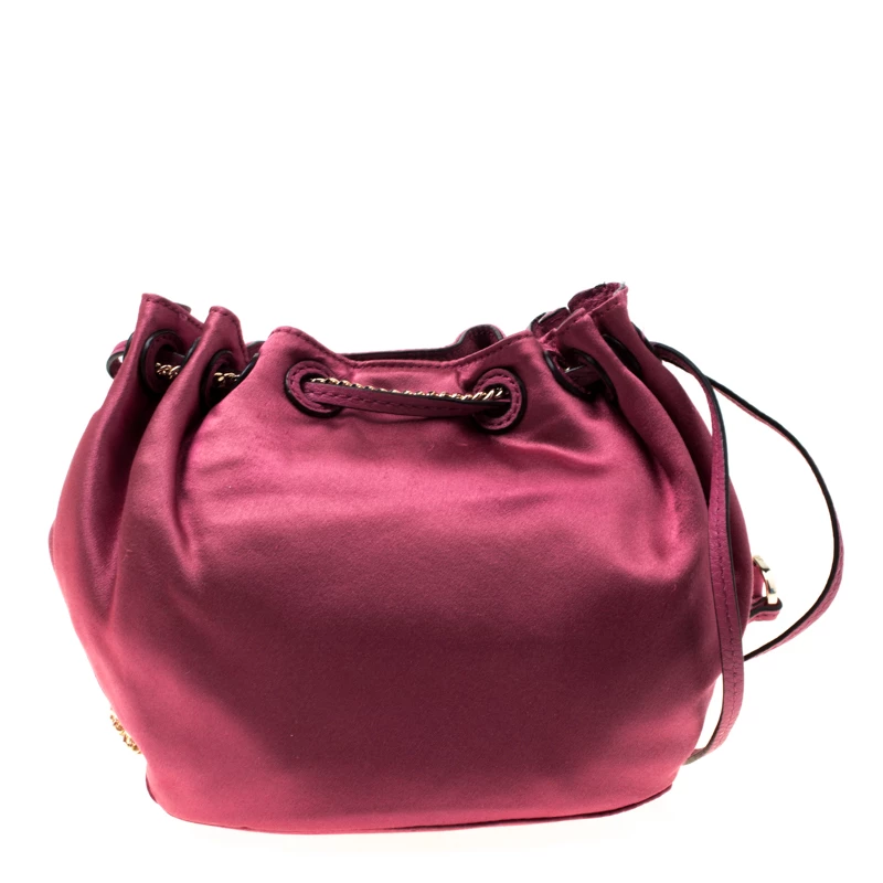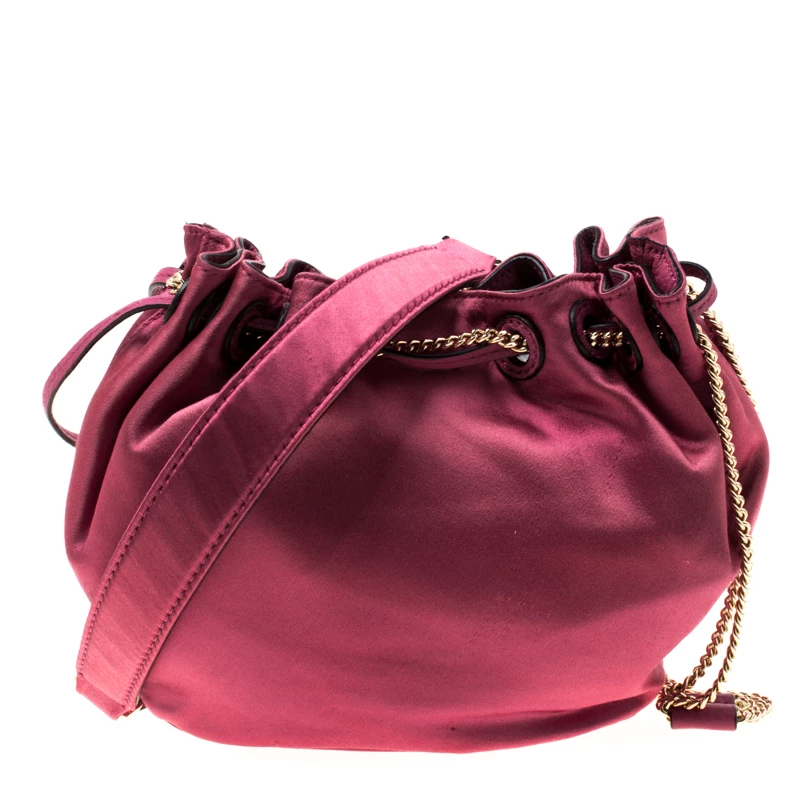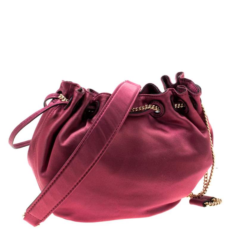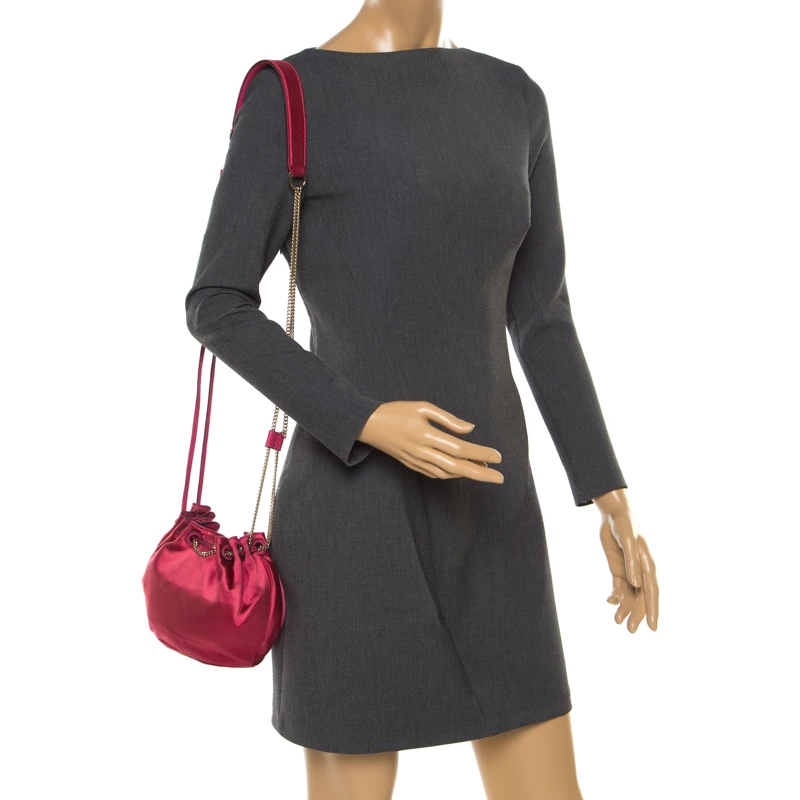 Flaunt a swanky fashion statement wherever you go with this Love Power bag from Diane Von Furstenberg. The bucket-shaped bag is made from stain and flaunts a chain and satin shoulder strap. A buttoned closure secures a well-sized nylon lined interior.