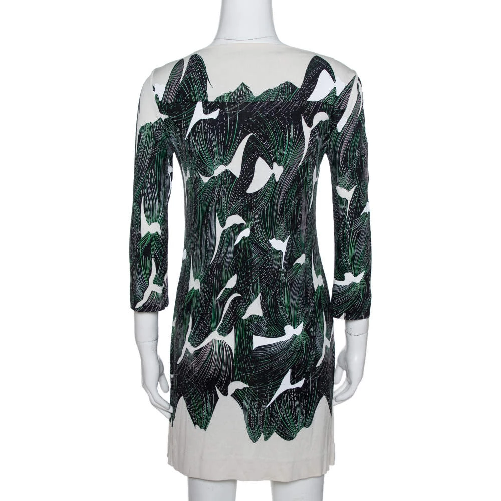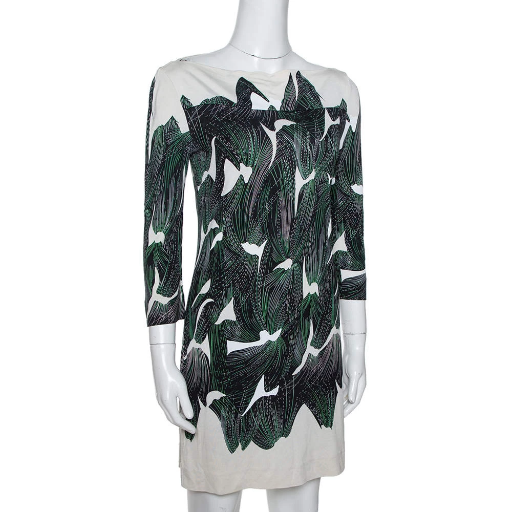 This dress is an example of Diane von Furstenberg’s unique aesthetics put together with brilliant tailoring. The shift dress has a cream shade along with a contrasting abstract print all over. It is tailored from silk with long sleeves and a closed neckline. It is bound to look great with pumps.