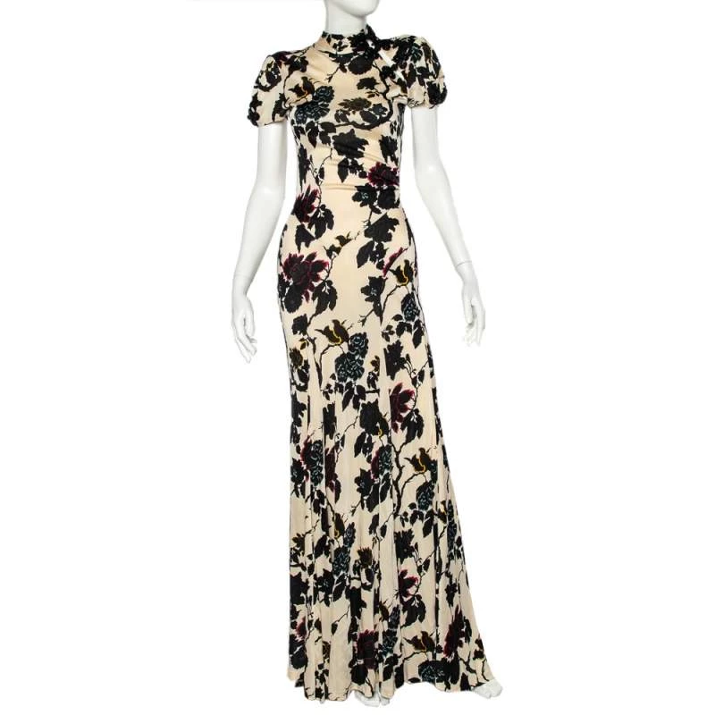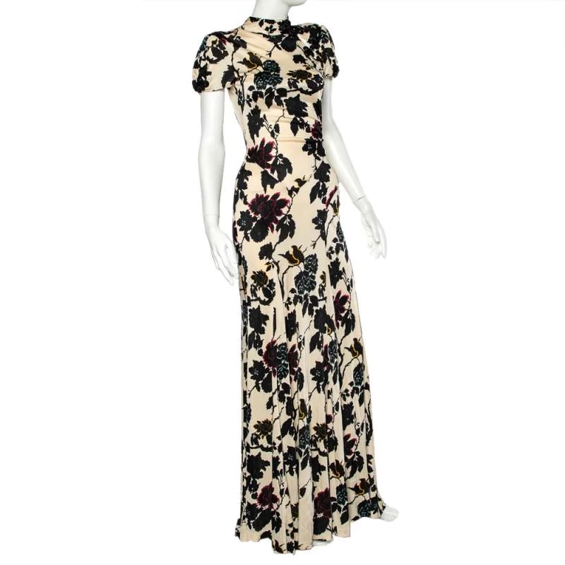 This dress from Diane Von Furstenberg is your go-to option for any event that you have to attend. The gown has a cream expanse printed with florals, an open back detail, and short sleeves. The evening gown has a buttoned closure and a lovely fit.