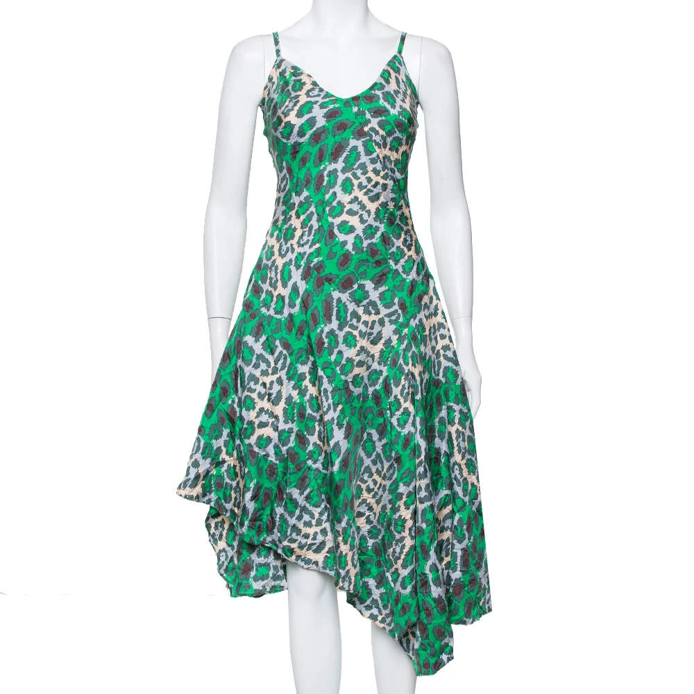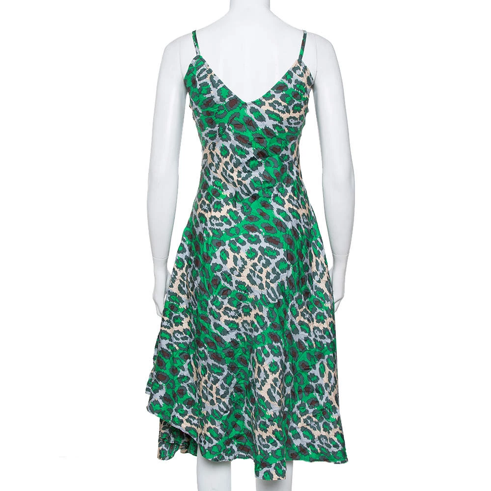 Creations from Diane Von Furstenberg leave no stone unturned for us to get impressed with their design and style! This green midi dress features an animal print design with a beautifully stitched asymmetrical hemline and the flattering silhouette is enhanced with a V-neckline. It will look amazing with pointed stilettoes and a sling bag.