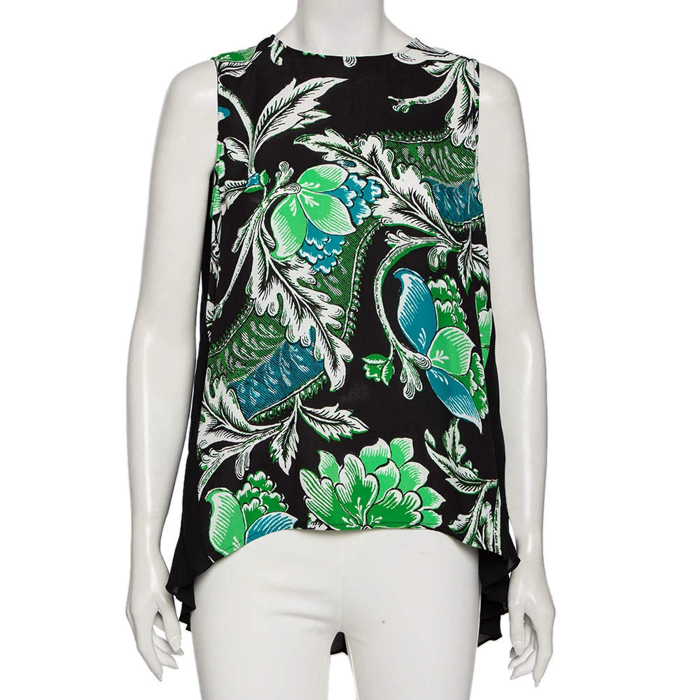 Get your hands on this elegant piece from Diane von Furstenberg today! This lovely blouse is cut from luxurious fabric and features a printed front and a solid black rear with a sleeveless silhouette