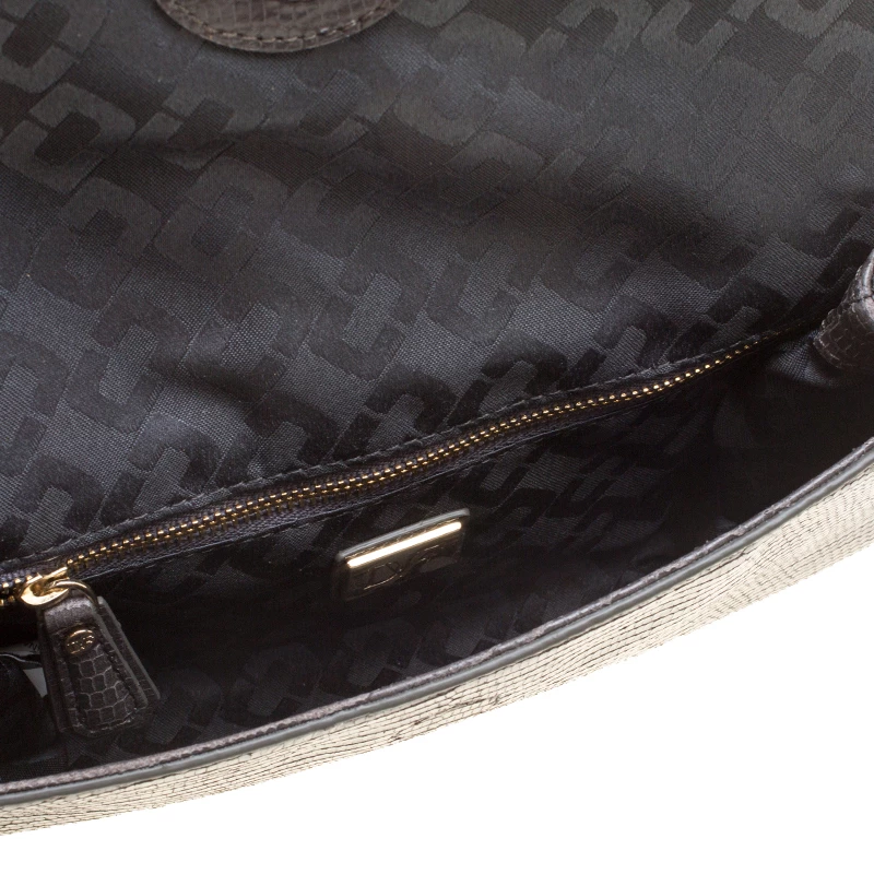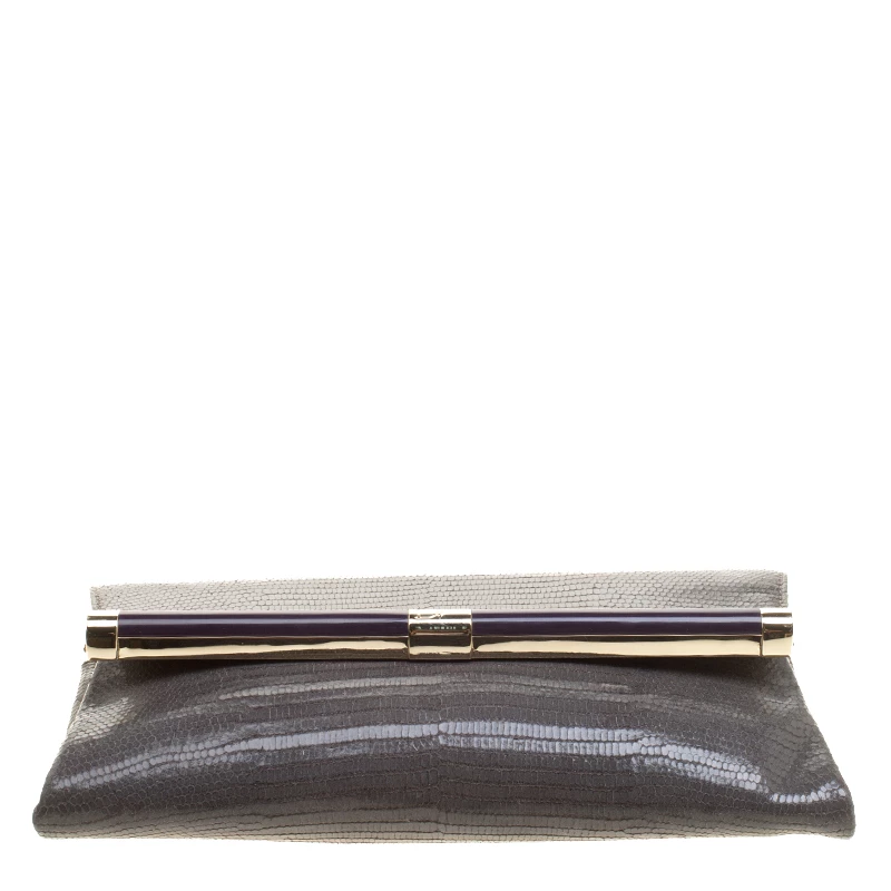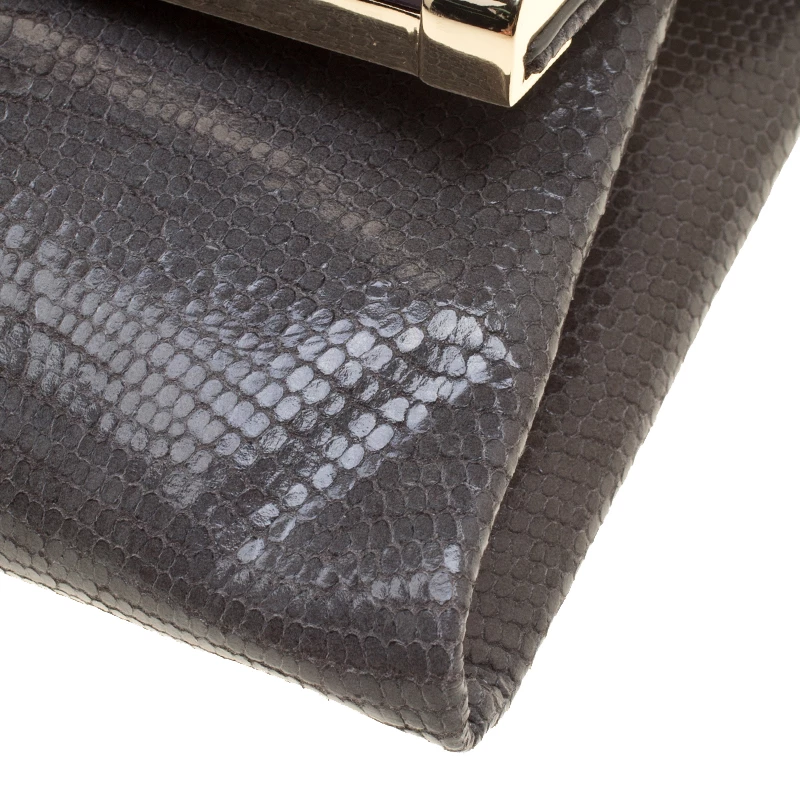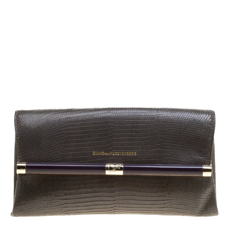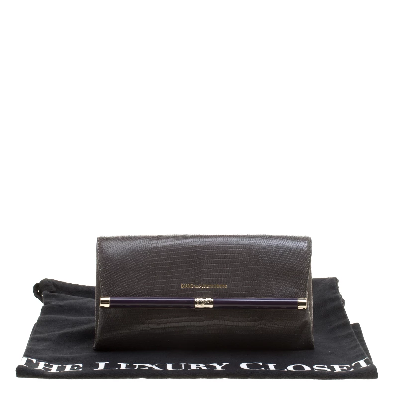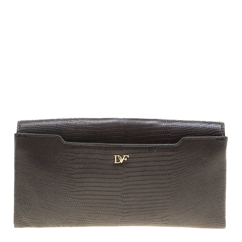 Finely crafted and high in appeal is this beautiful envelope clutch by Diane Von Furstenberg. It has been crafted from lizard-embossed leather and shaped beautifully. The grey clutch has a flap which secures the well-sized fabric interior with a zip pocket for safely keeping your essentials. This creation is luxe and gorgeous.