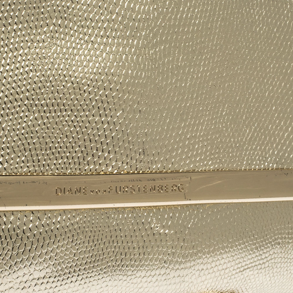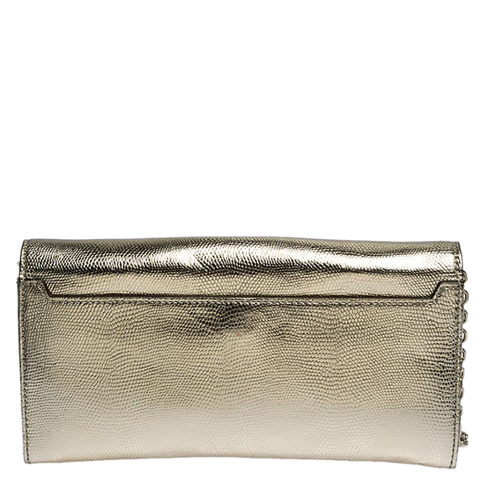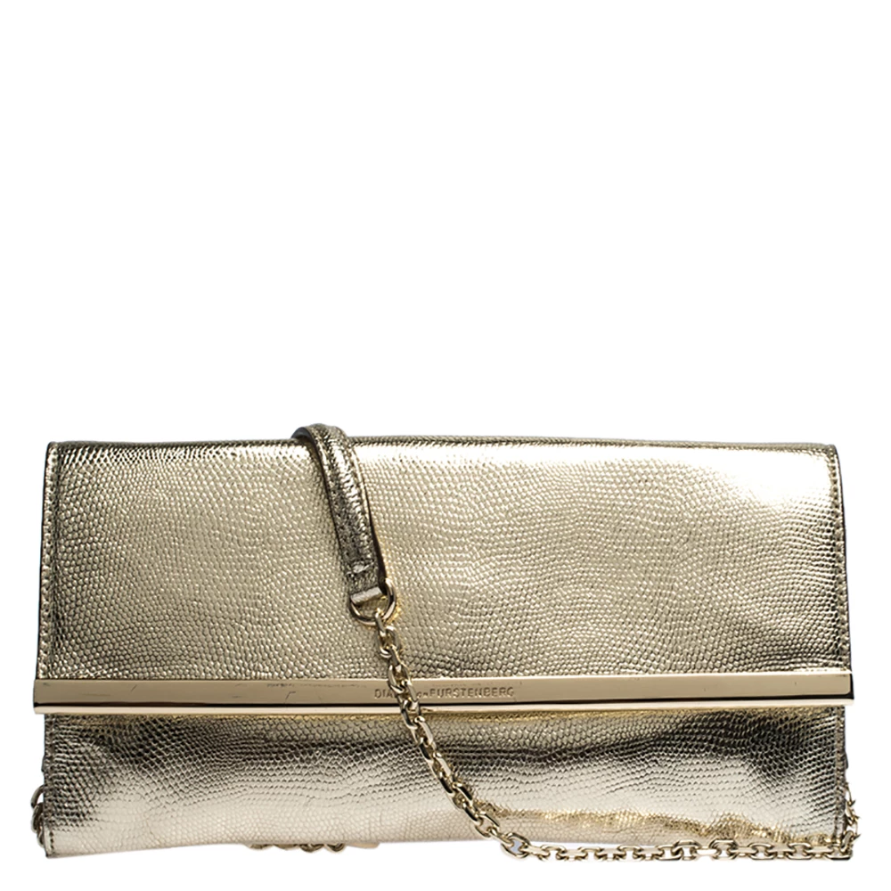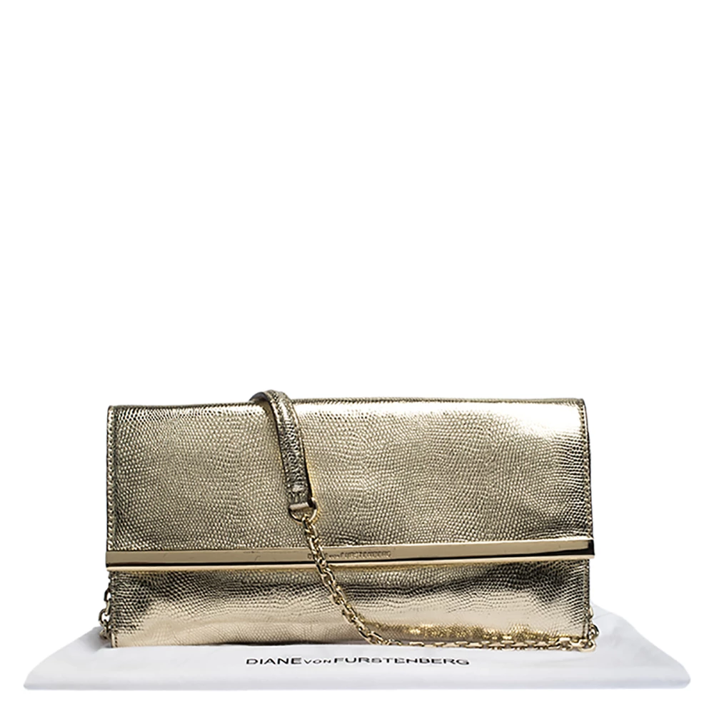 This lovely clutch comes from the house of Diane Von Furstenberg. It is crafted from metallic gold lizard-embossed leather. It is styled with a front flap that opens to a spacious nylon interior. It is finished with a gold-tone chain-link strap for you to swing it.