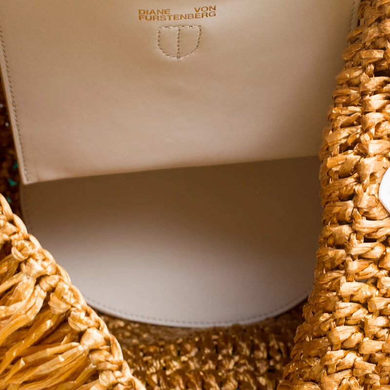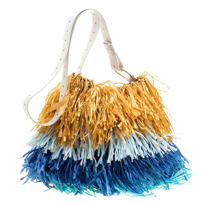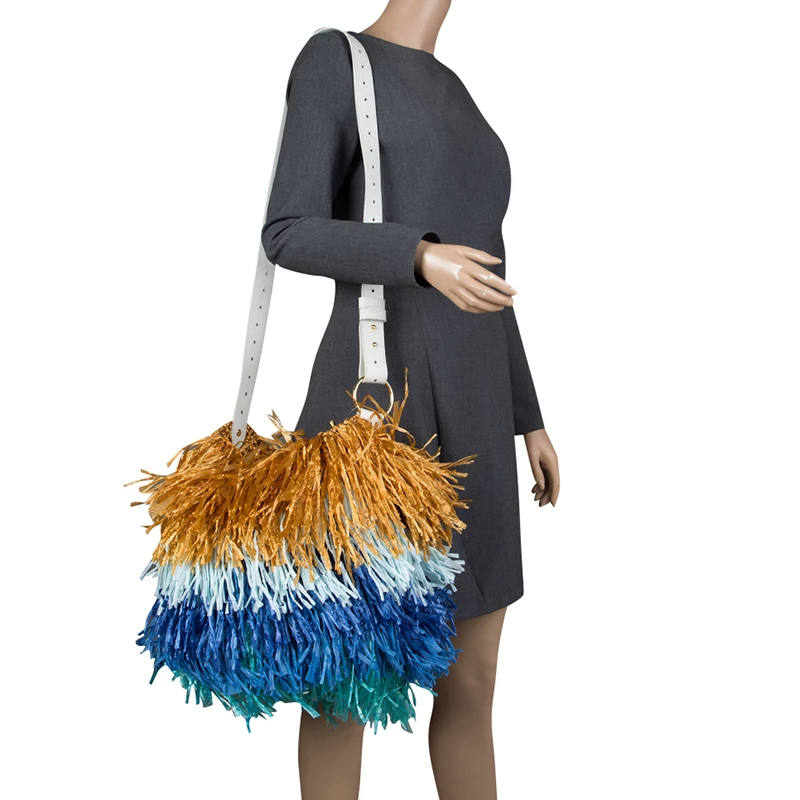 Create the most fun and flirty summer looks by pairing this beautiful Diane Von Furstenberg tote bag with your casual and day party looks. Crafted with raffia material, this bag is covered in eye catching and colourful leather fringes all across with an elegant white leather top strap that makes it perfectly convenient for you to carry it around.