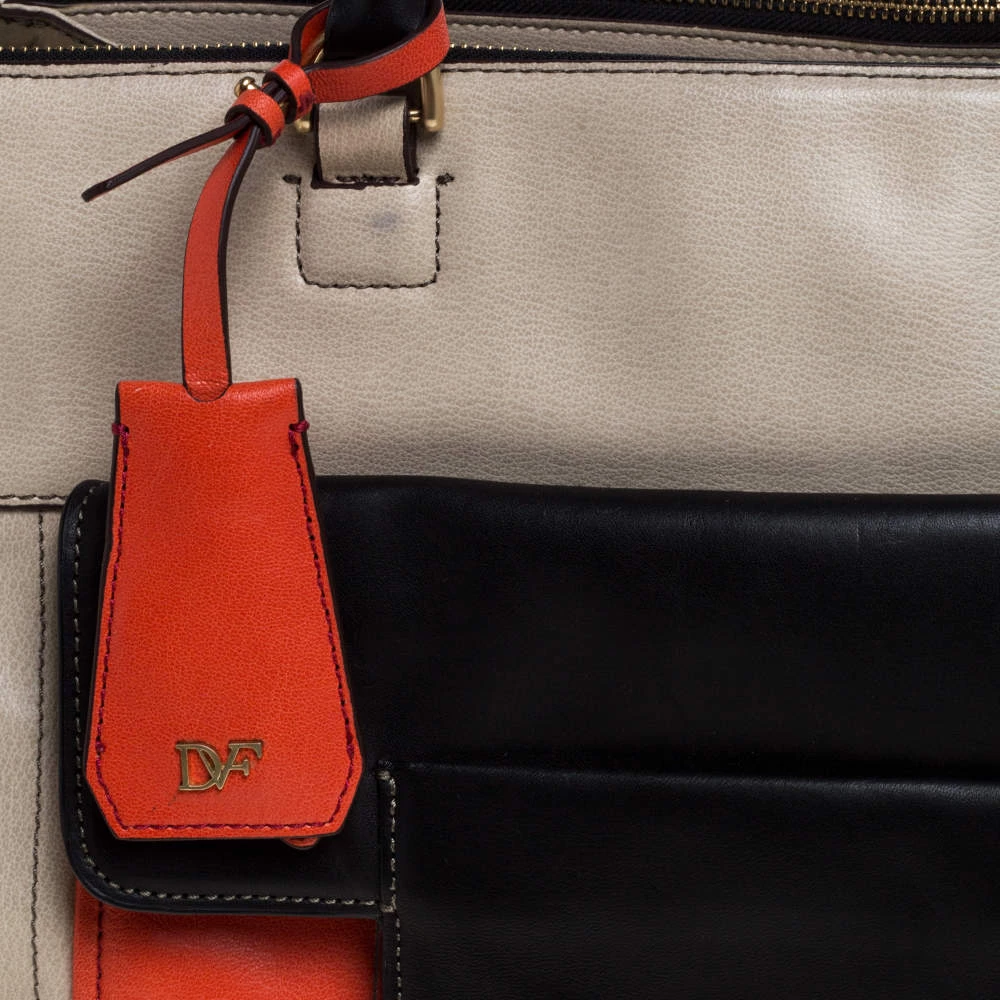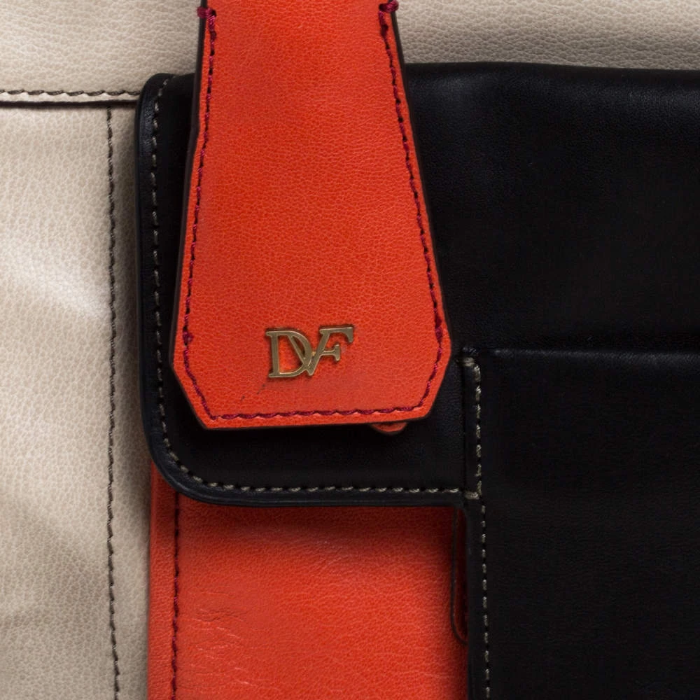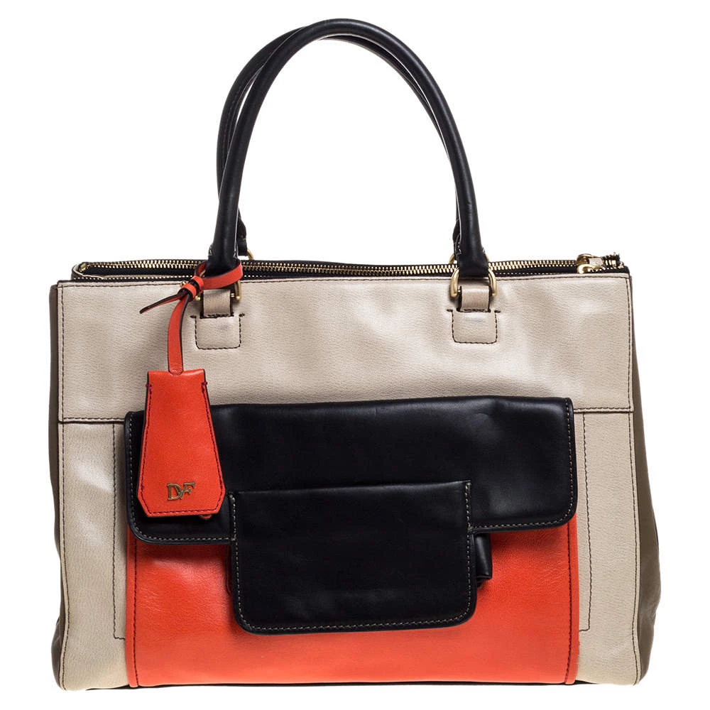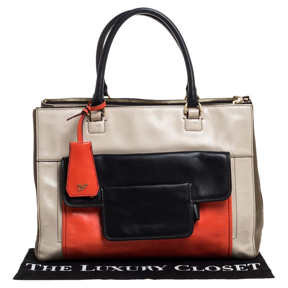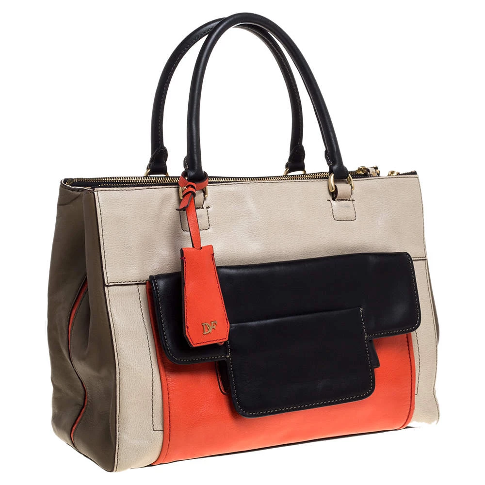 Durable and chic, this Diane Von Furstenberg satchel is perfect for everyday use. It features a multicolored leather body detailed with a front flap pocket and a structured top. The zipper closure opens to a fabric-lined interior featuring spacious compartments. Complete with dual top handles, this bag profiles the brand logo on the rear accompanied by a slip pocket.