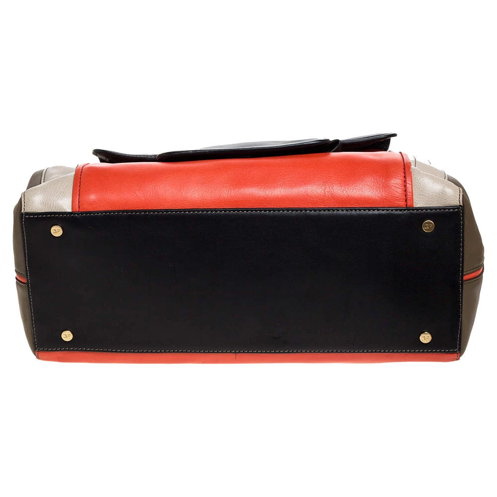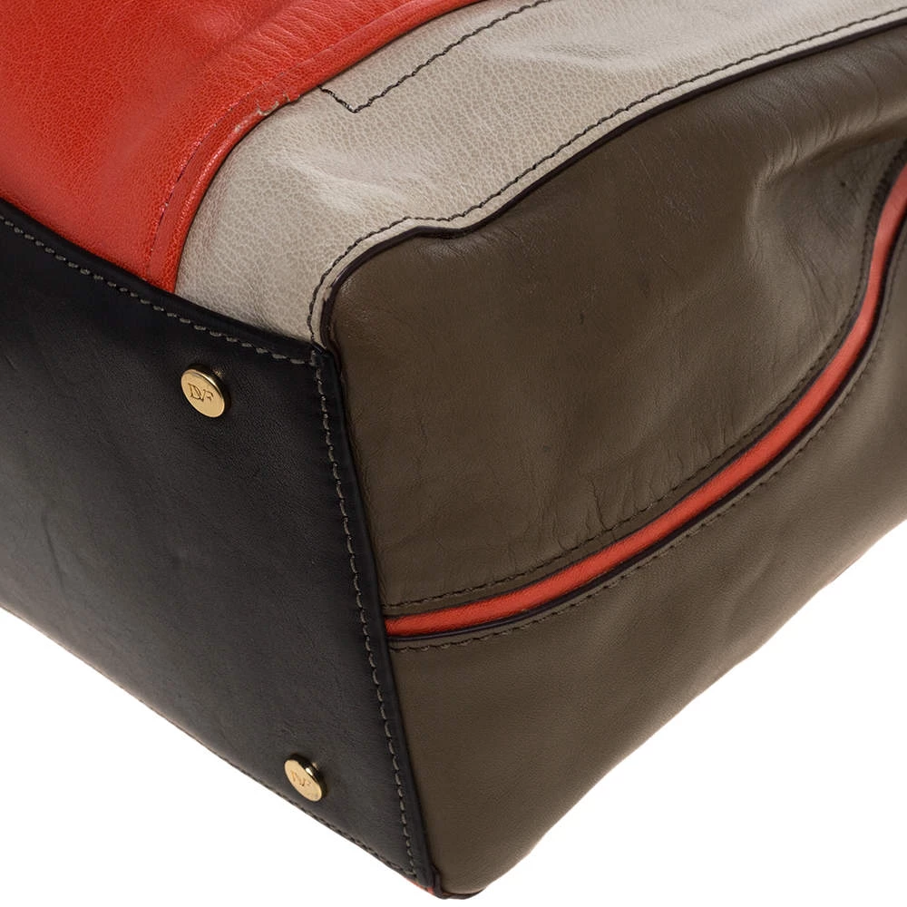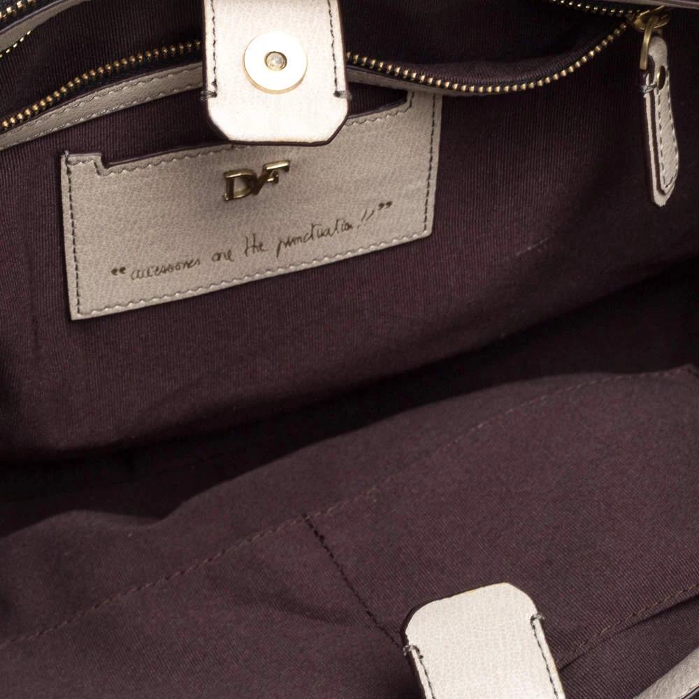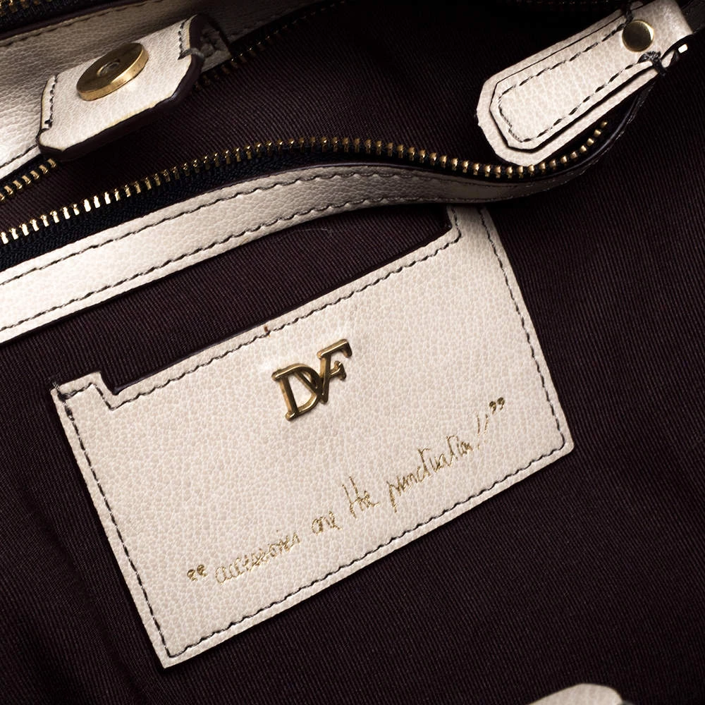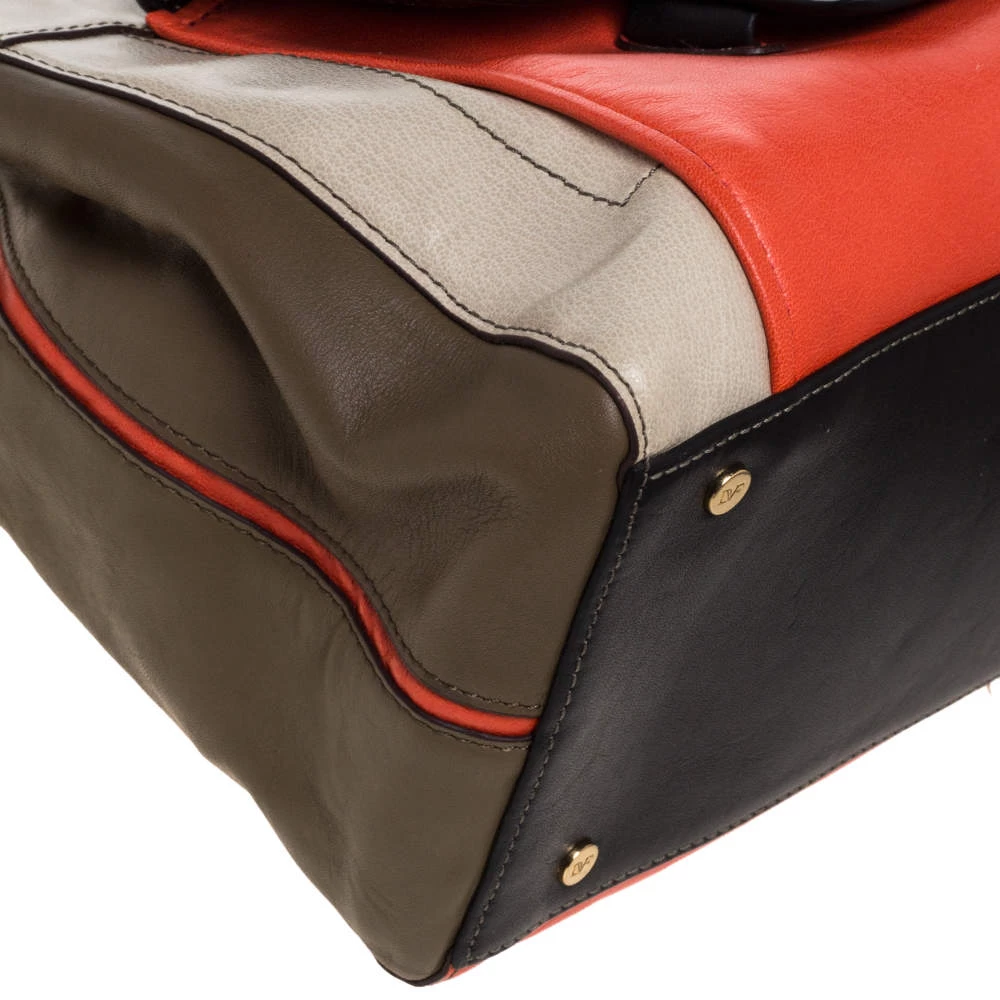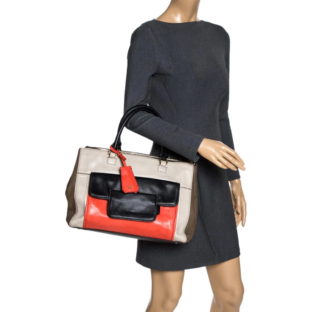 Durable and chic, this Diane Von Furstenberg satchel is perfect for everyday use. It features a multicolored leather body detailed with a front flap pocket and a structured top. The zipper closure opens to a fabric-lined interior featuring spacious compartments. Complete with dual top handles, this bag profiles the brand logo on the rear accompanied by a slip pocket.