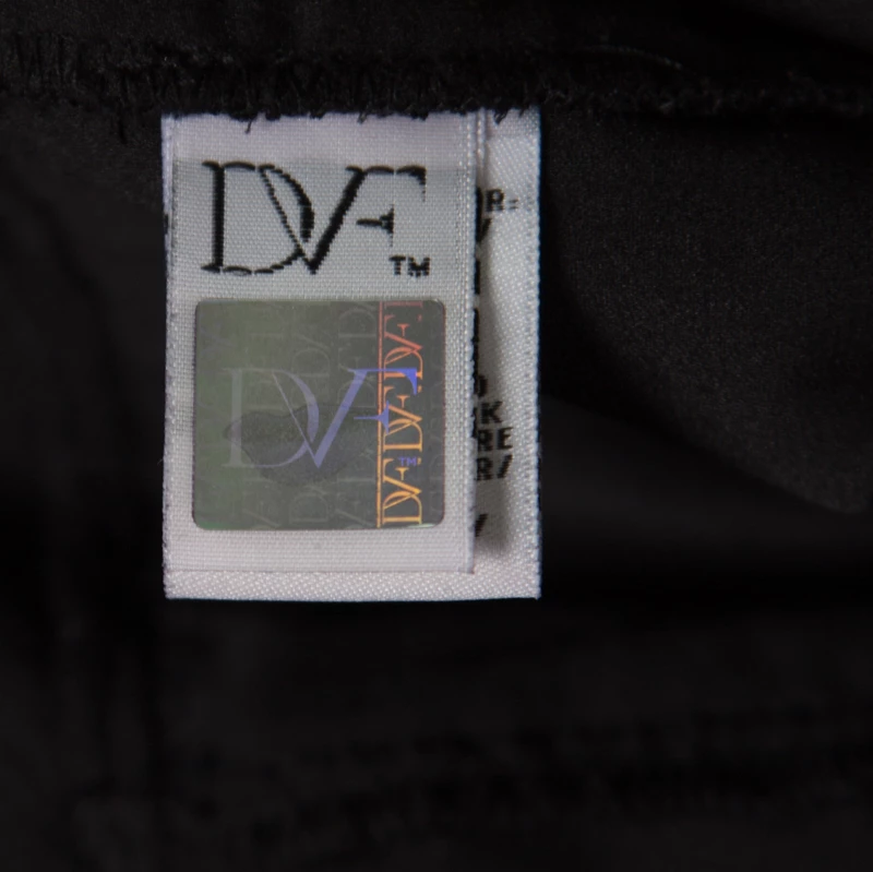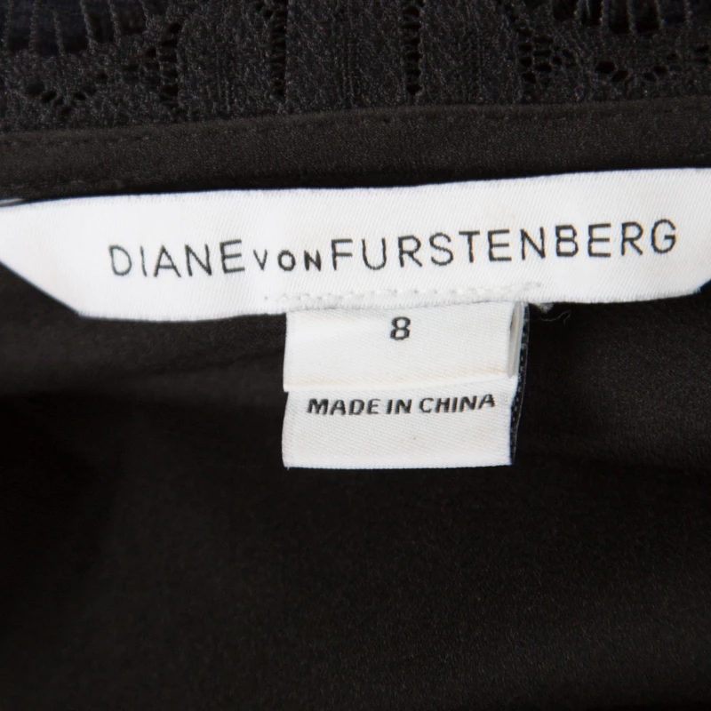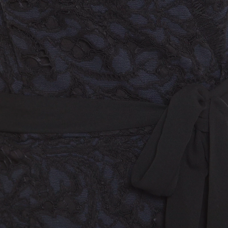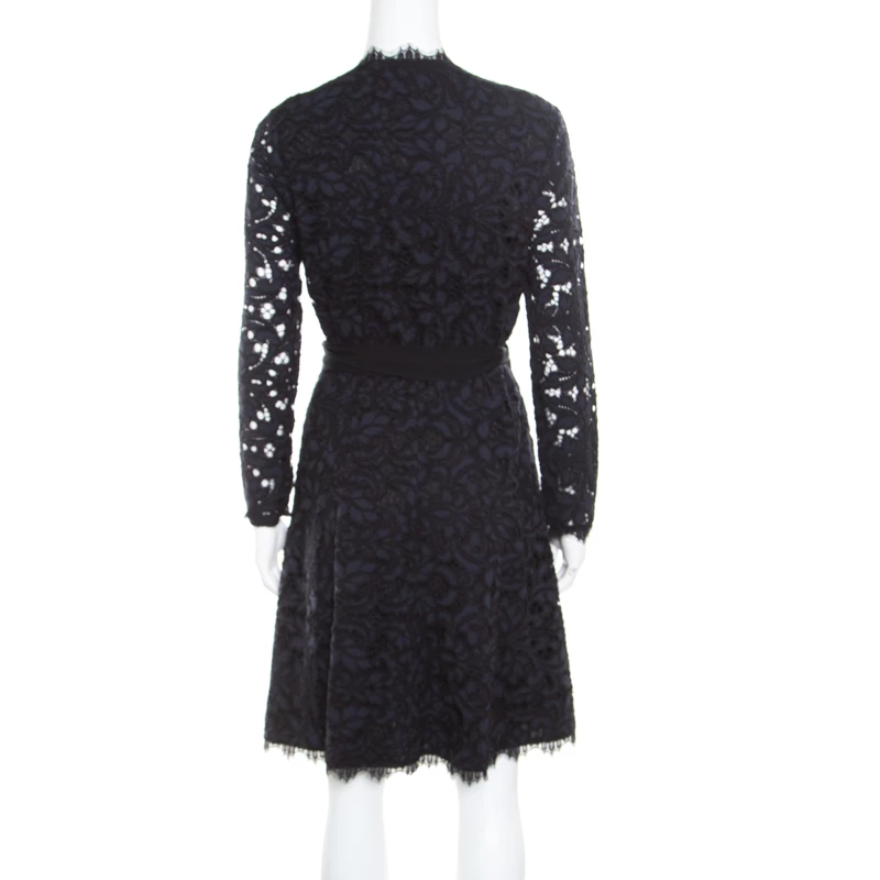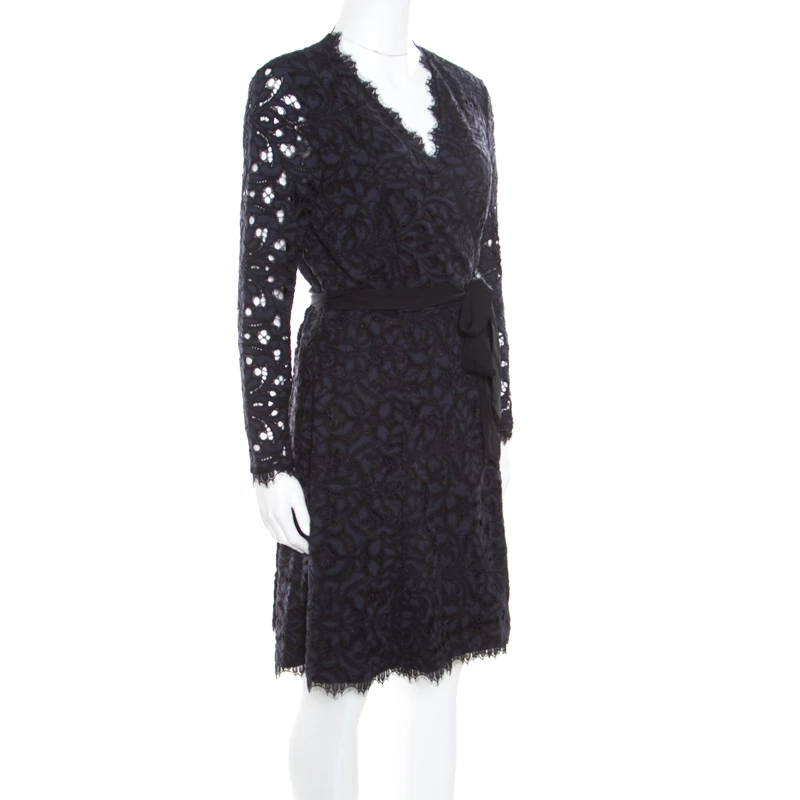 This Diane Von Furstenberg dress is a must have in every fearless fashionista’s wardrobe and is worth giving a try! The lovely navy blue and black creation is made of a cotton blend and styled with an overlay of guipure lace. It flaunts a wrap-around silhouette and scalloped trims detailed on the V-neckline, long sleeves and on the bottom hem. Sure to lend you a great fit, it comes equipped with a self-tie belt on the waist and can be paired well with pointed pumps and an embellished cocktail ring for a special event.