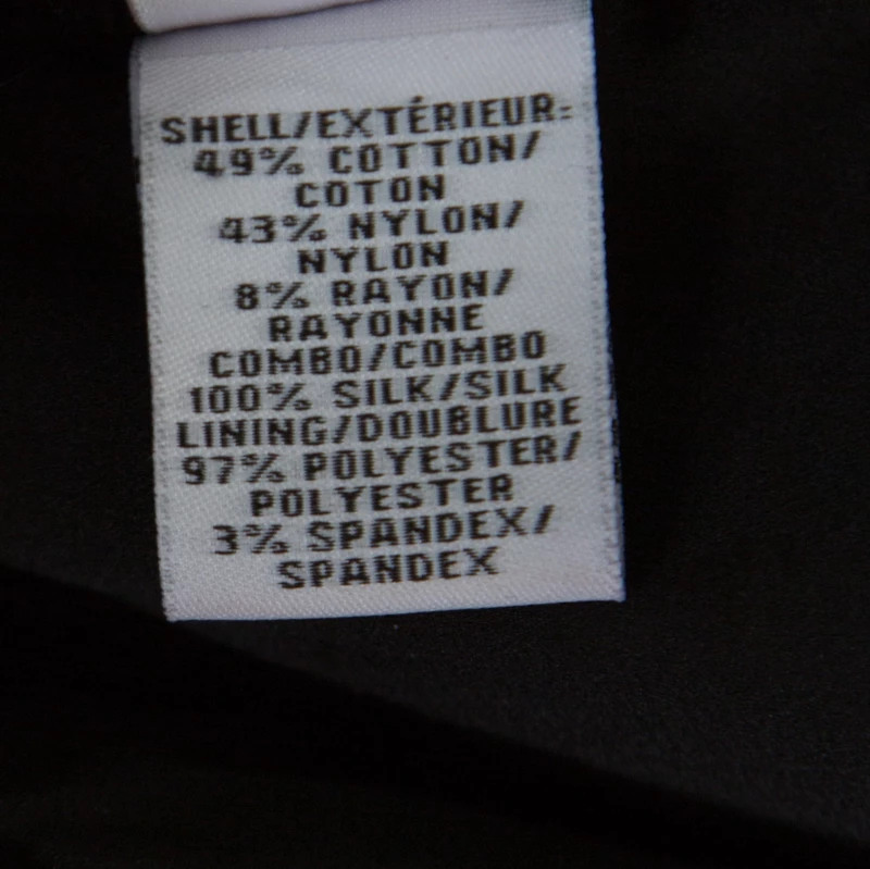 - Fabric: Shell: 49% Cotton , 43% Nylon , 8% Rayon ; Combo: 100% Silk ( Lining: 97% Polyester , 3% Spandex )