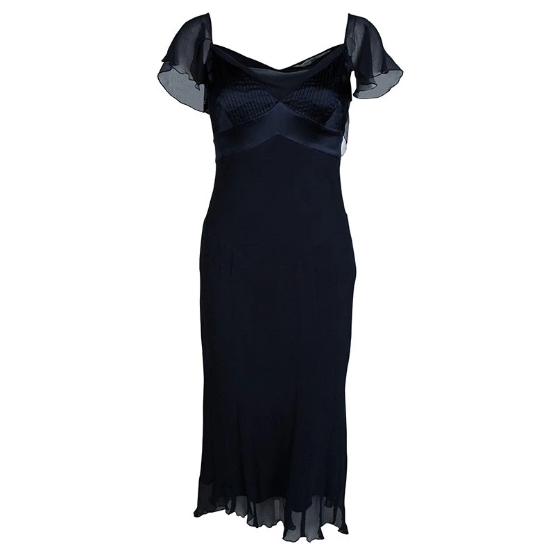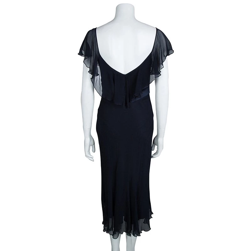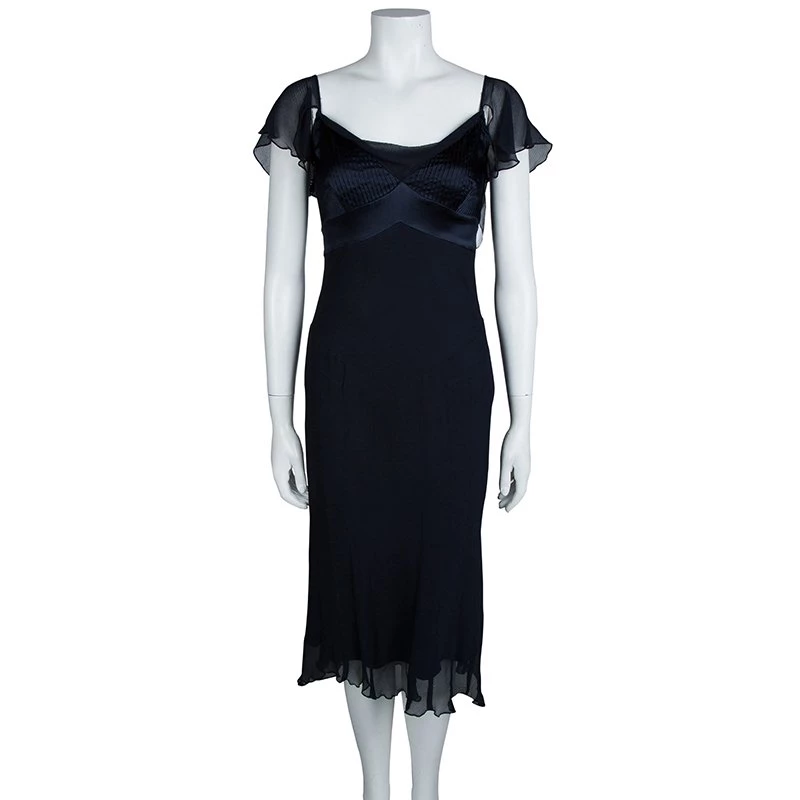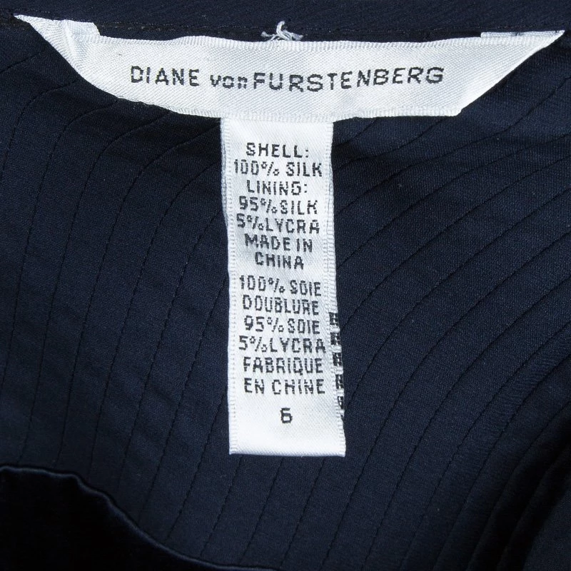 Diane Von Furstenbergโs navy blue Mia dress is a contemporary piece. Created for a form-fitting silhouette, this crinkle silk chiffon dress is detailed with pintuck bodice for a feminine finish. The deep back with ruffled overlay creates graceful movement.
