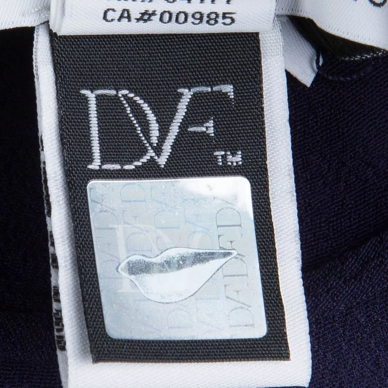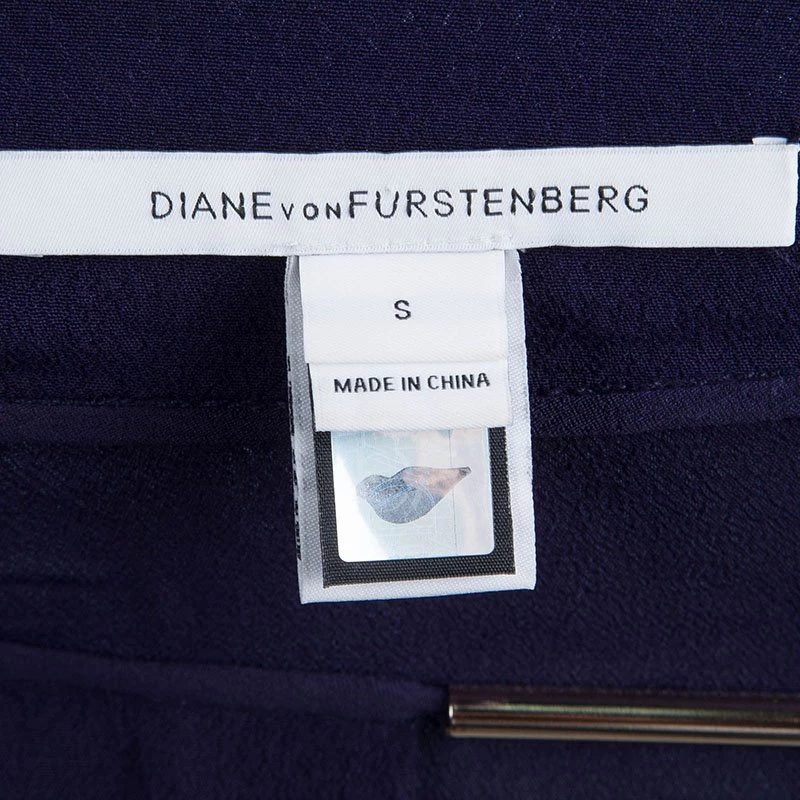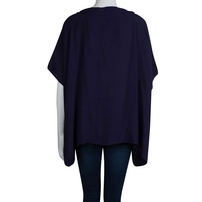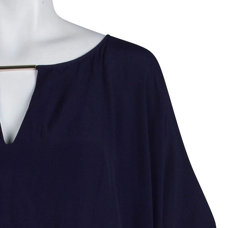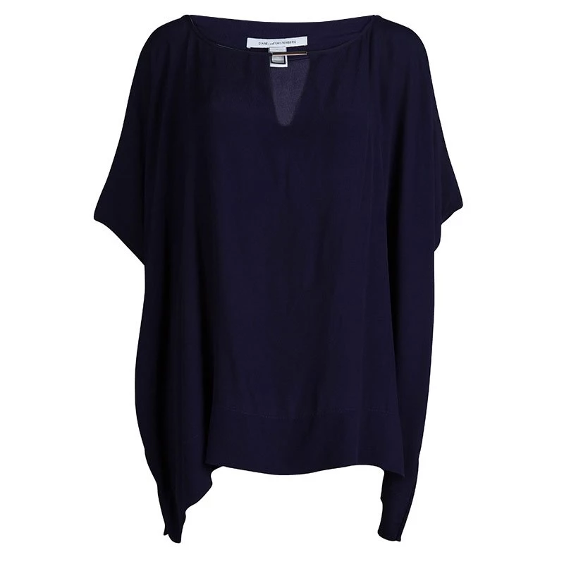 Diane von Furstenberg launched her eponymous label in the early ’70s. This navy blue crepe top has a boat neck and a centre neckline V-slit with a gold metal tube detail. In an oversized loose fitting silhouette, this blouse features batwing half sleeves and is draped longer at each side.