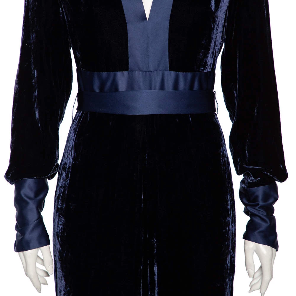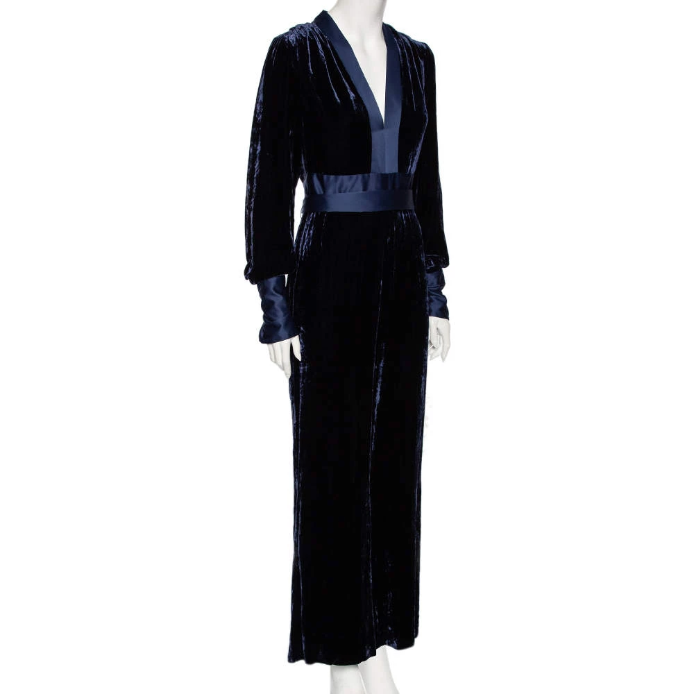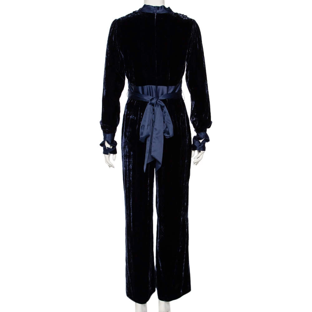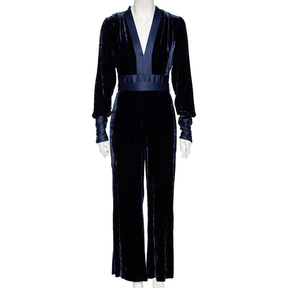 This Diane Von Furstenberg jumpsuit will equip you to deliver elegant and fashionable looks. Crafted from plush velvet, this luxurious creation comes in navy blue and flaunts satin trims. It has long sleeves & a v-neckline that is flattering. It comes with long pants and has a tailored fit.