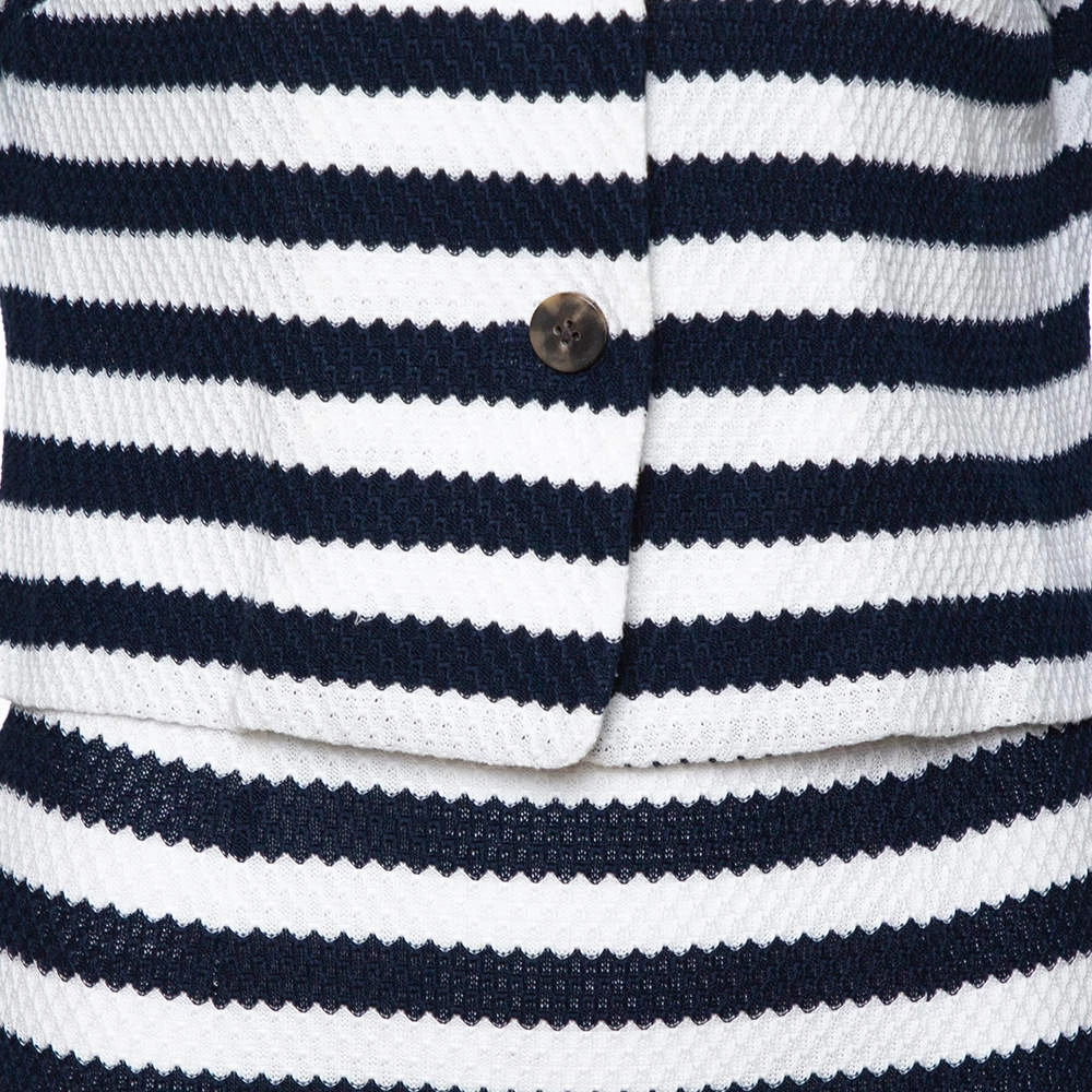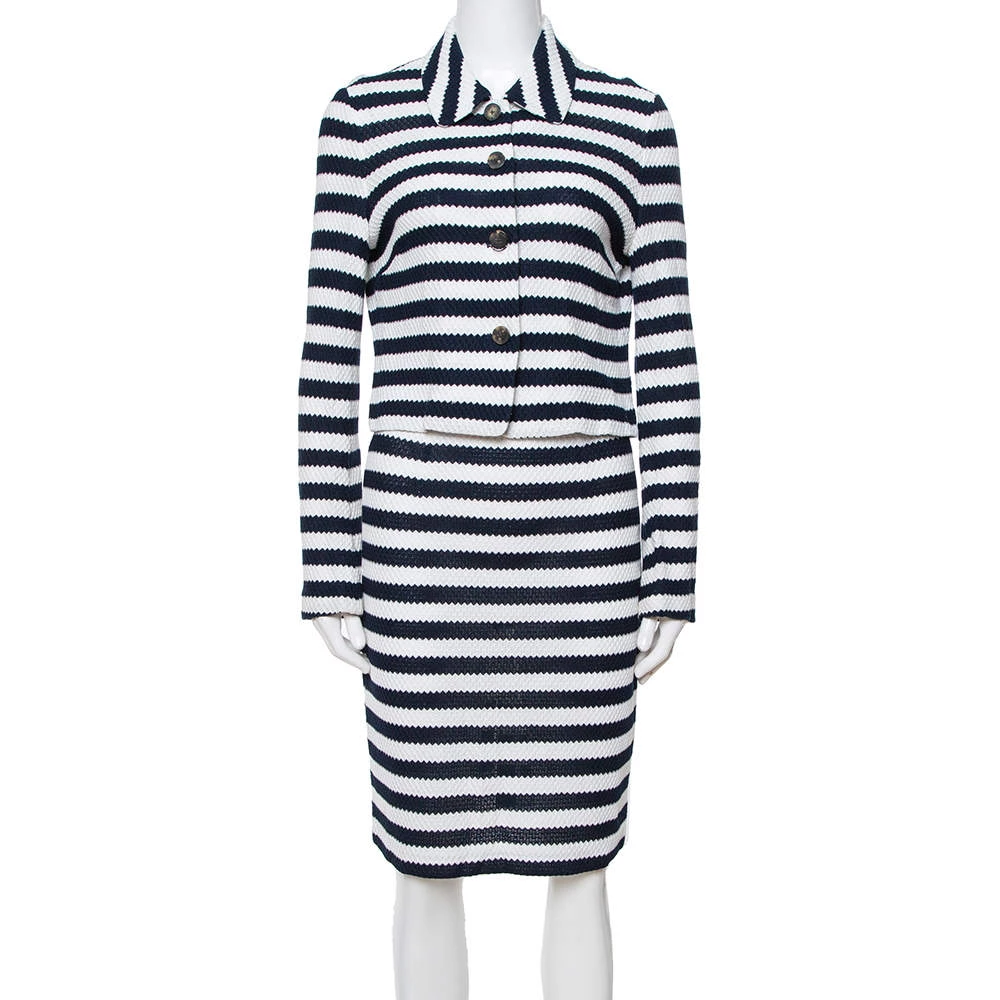 This Diane von Furstenberg set is too beautiful for words. The set features a jacket and a matching skirt. They are made from cotton. The jacket has long sleeves with a front button while the skirt is cut to a knee-length. Team the set with a pair of pumps.