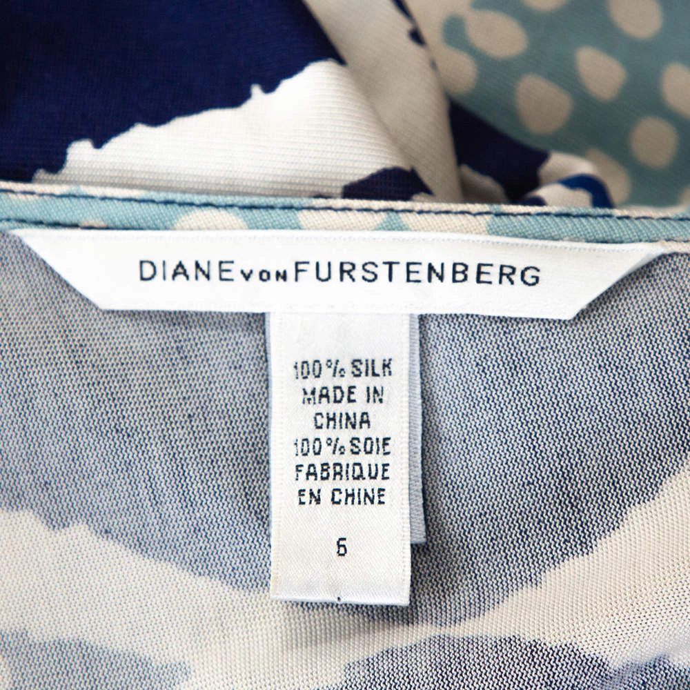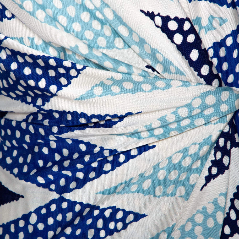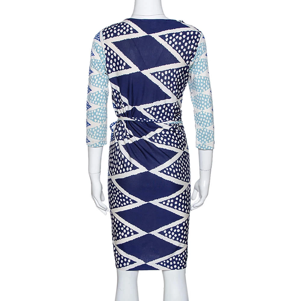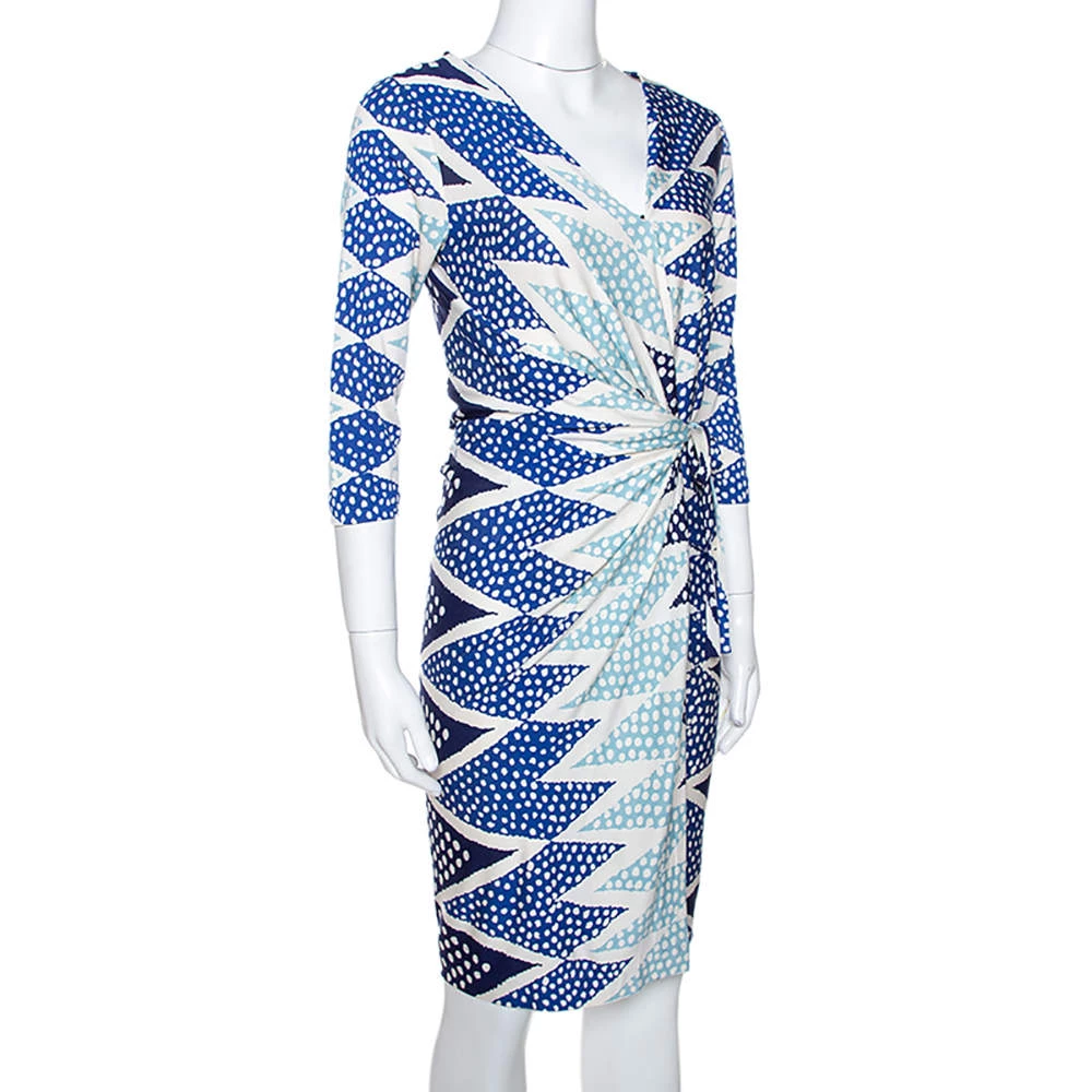 Ethereal to look at, this Evrin wrap dress from Diane Von Furstenberg is sure to make you outshine everyone on a fashionable outing. This blue dress is made of 100% silk and features an ornamentalist diamond print pattern all over it. It also flaunts a V-neckline and a wrap-around, tie-up detail at the waist. Quite unique and very modern, pair this dress with metallic pointed pumps and a clutch to make heads turn.