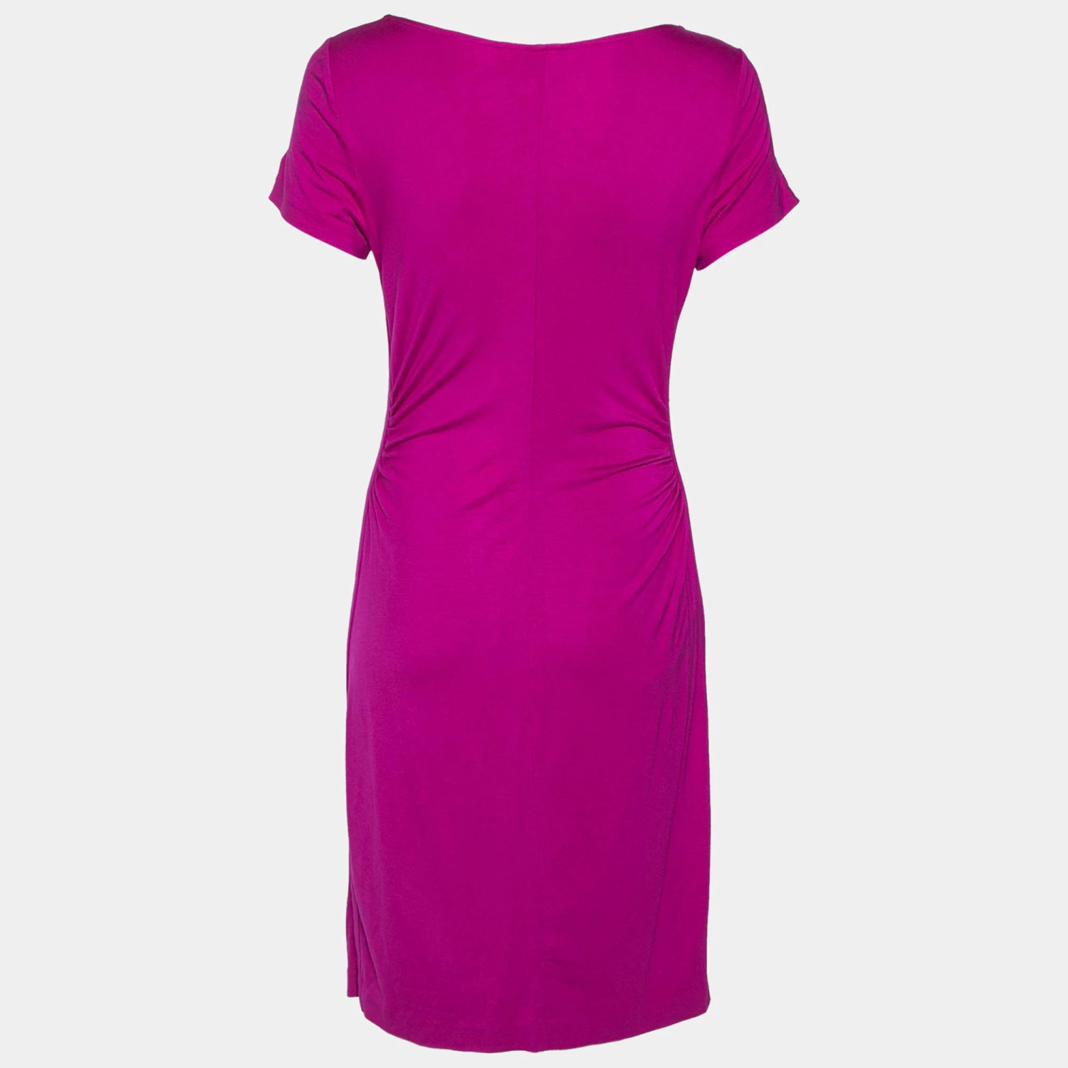 This dress from Diane von Furstenberg is made to offer elegance and class. It is created using pink jersey fabric and features ruched detailing on the sides and short sleeves. Elevate your style by wearing this dress.