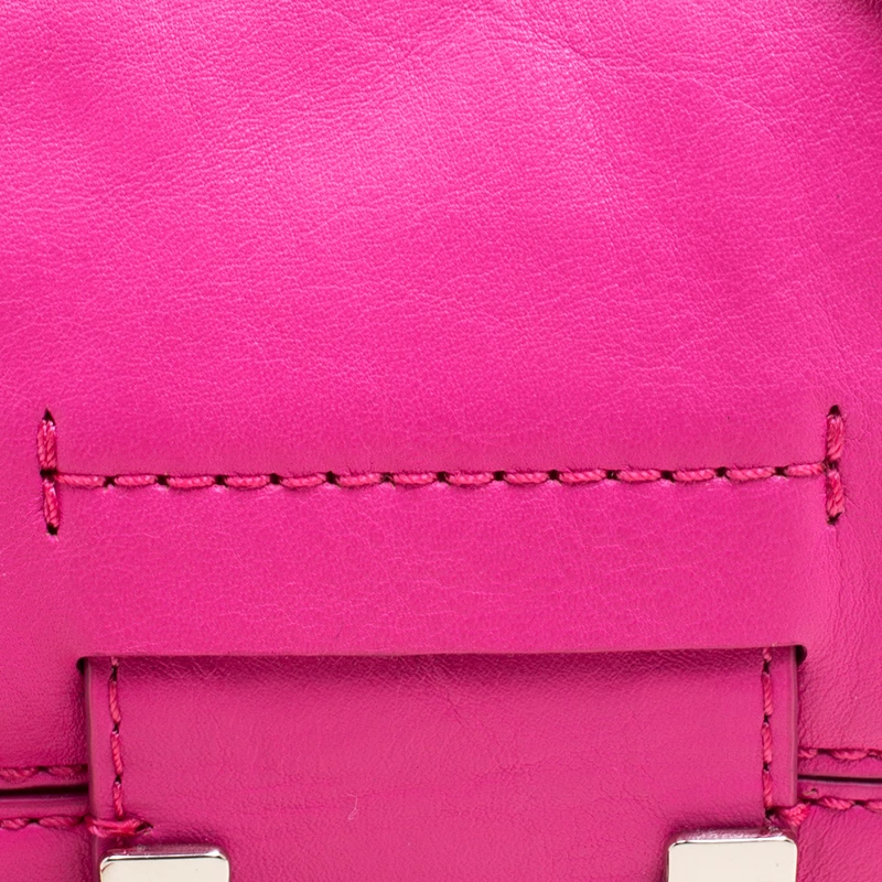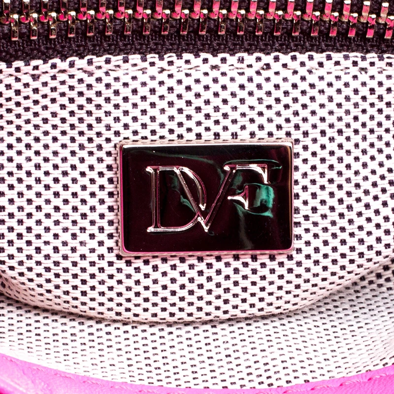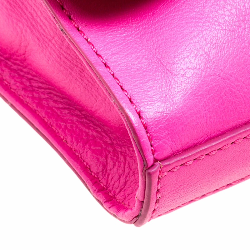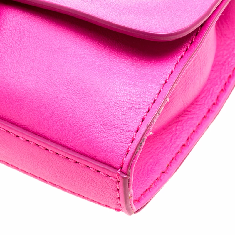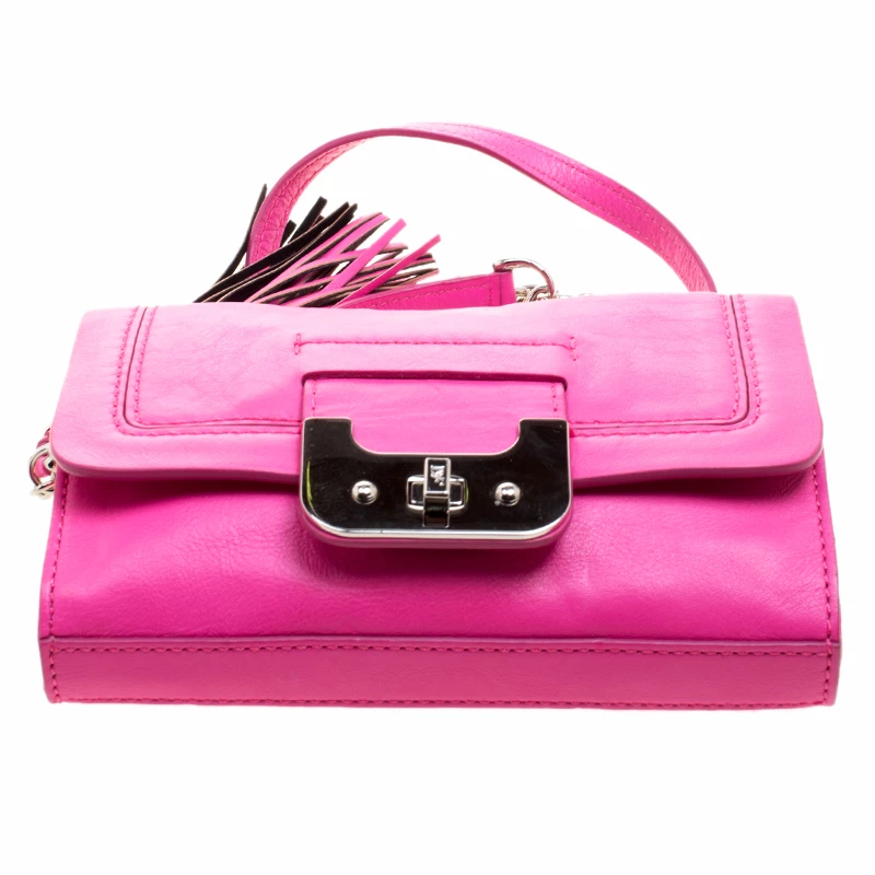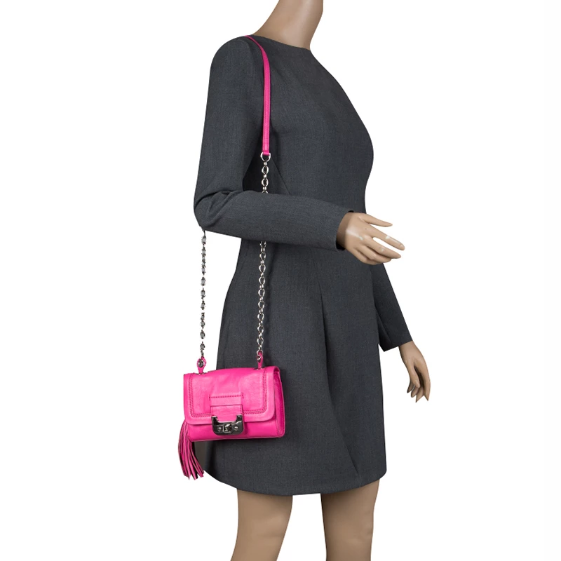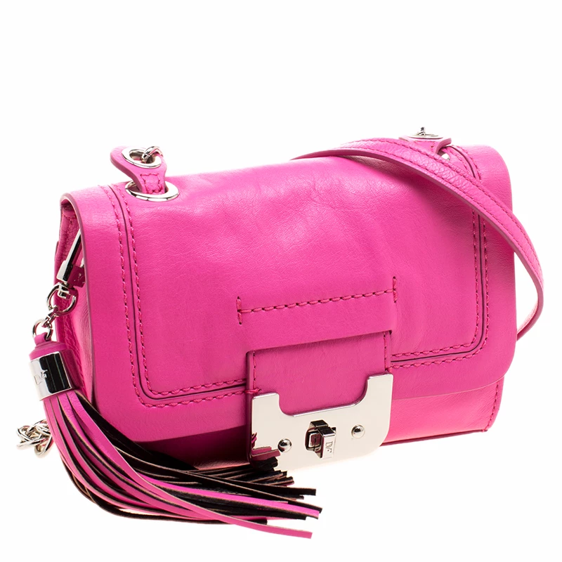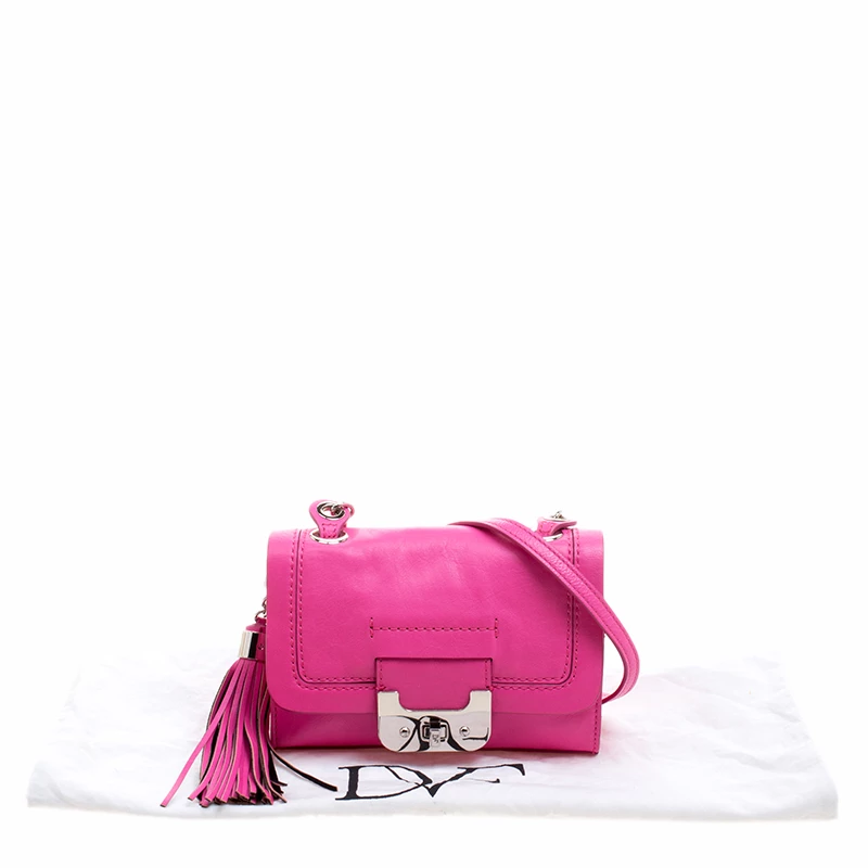 Diane Von Furstenberg brings to you this stunning and statement Mini Harper crossbody bag. Crafted in bright and bold pink leather, this bag features a silver tone twist lock closure on the front flap along with the signature DVF logo in silver metal at the back. With a tasselled detail at one side, this bag is completed with chain and leather connected long strap.