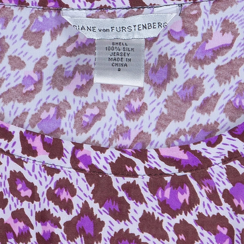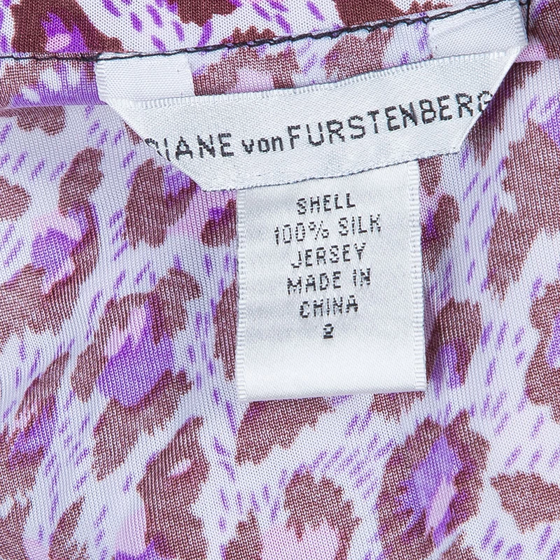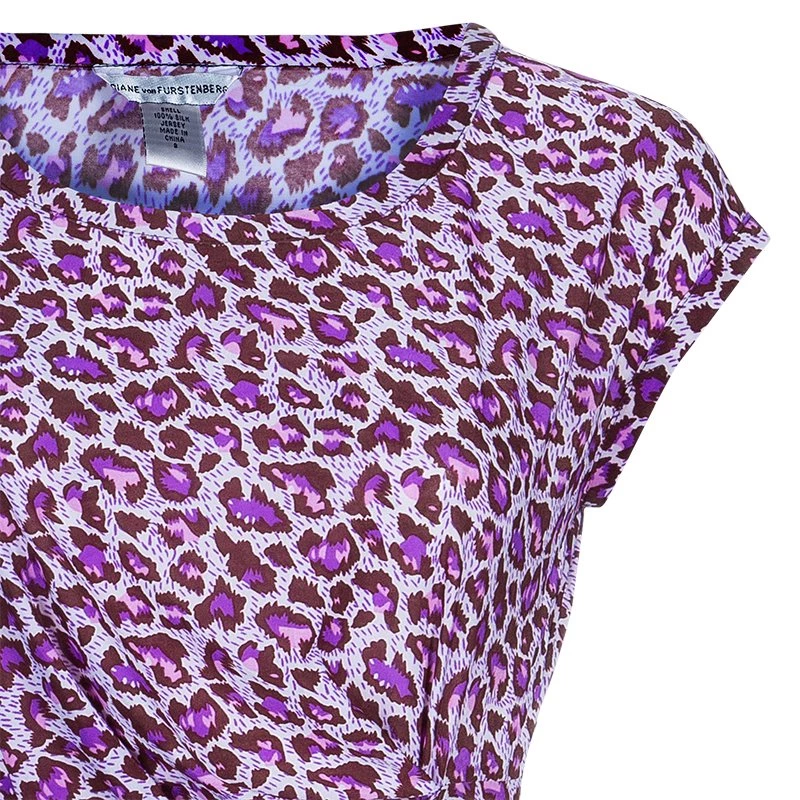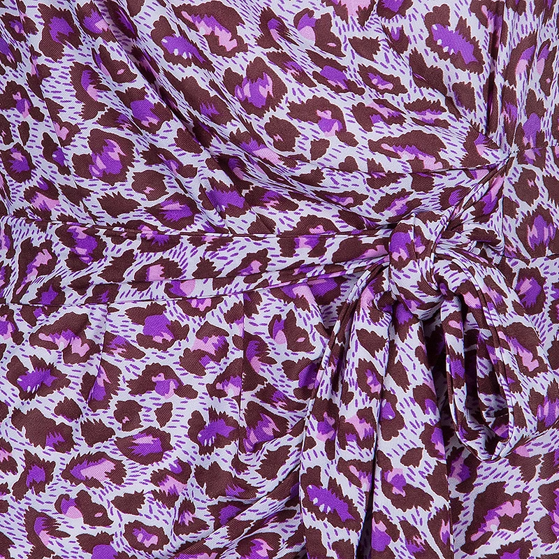 Perfect for spring or summer, this Diane von Furstenberg dress will give you a vibrant faceted update. Cut in silk, this New Della dress features a purple leopard print over a white base. With a wrap design it is accentuated with a tie-belt. It comes with a round neckline and short sleeves.