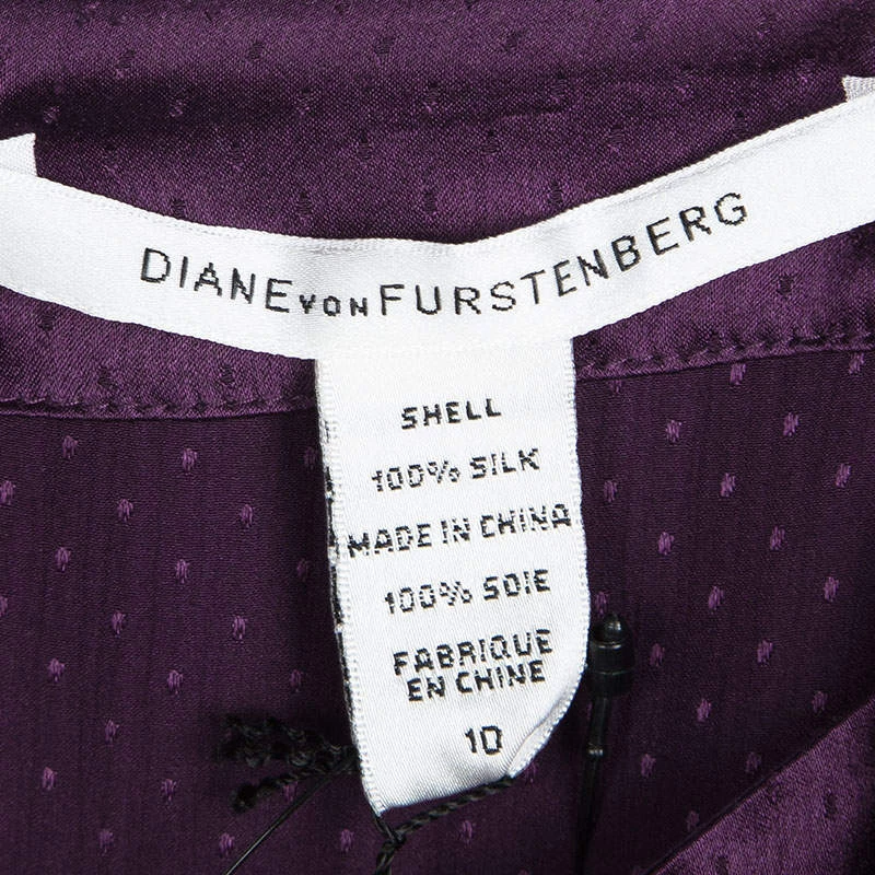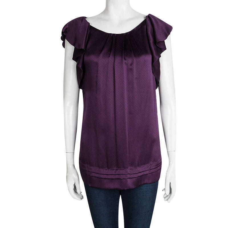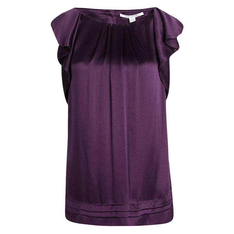 Diane Von Furstenberg brings to you this outstanding and very unique Lindella top for all your fashionable outings. In a regal purple shade, this top is made of 100% silk and features a round neckline, ruffle details on the sleeves and a concealed closure at the back. The bottom hem is layered and this creation is sure to grab you attention wherever you go.