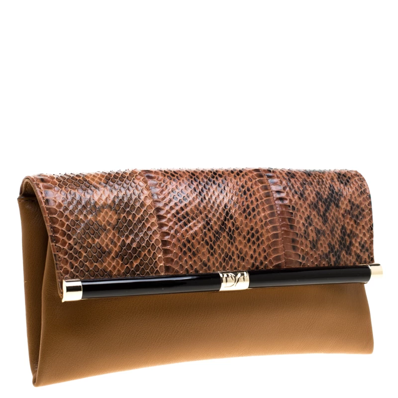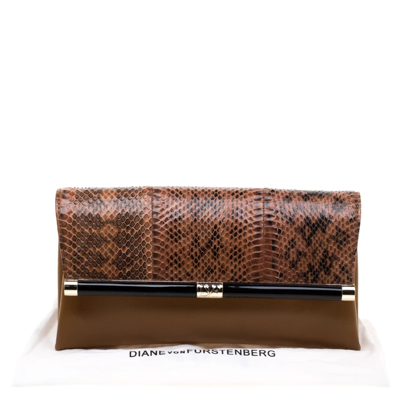 Perfect to carry everywhere, this envelope clutch from Diane Von Furstenberg is a must-have! Crafted from leather, the piece features python flap which is detailed with metal accents and logo engravings. It is equipped with a fabric-lined interior, housing a zip pocket, for you to carry your essentials in.