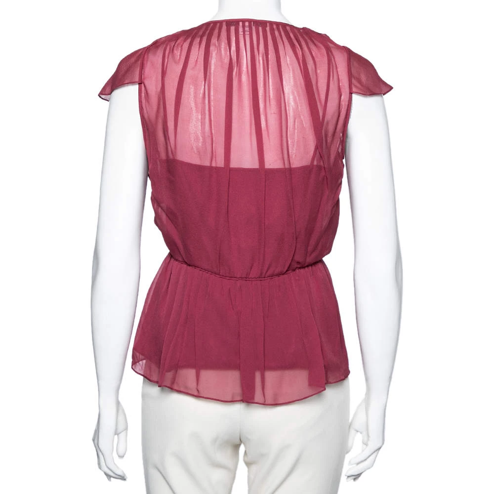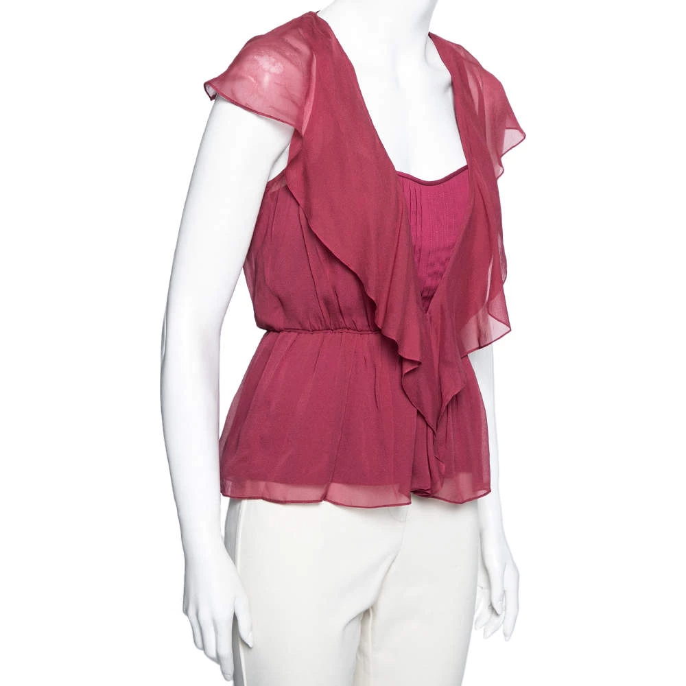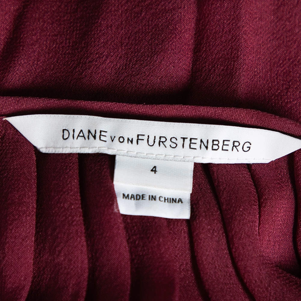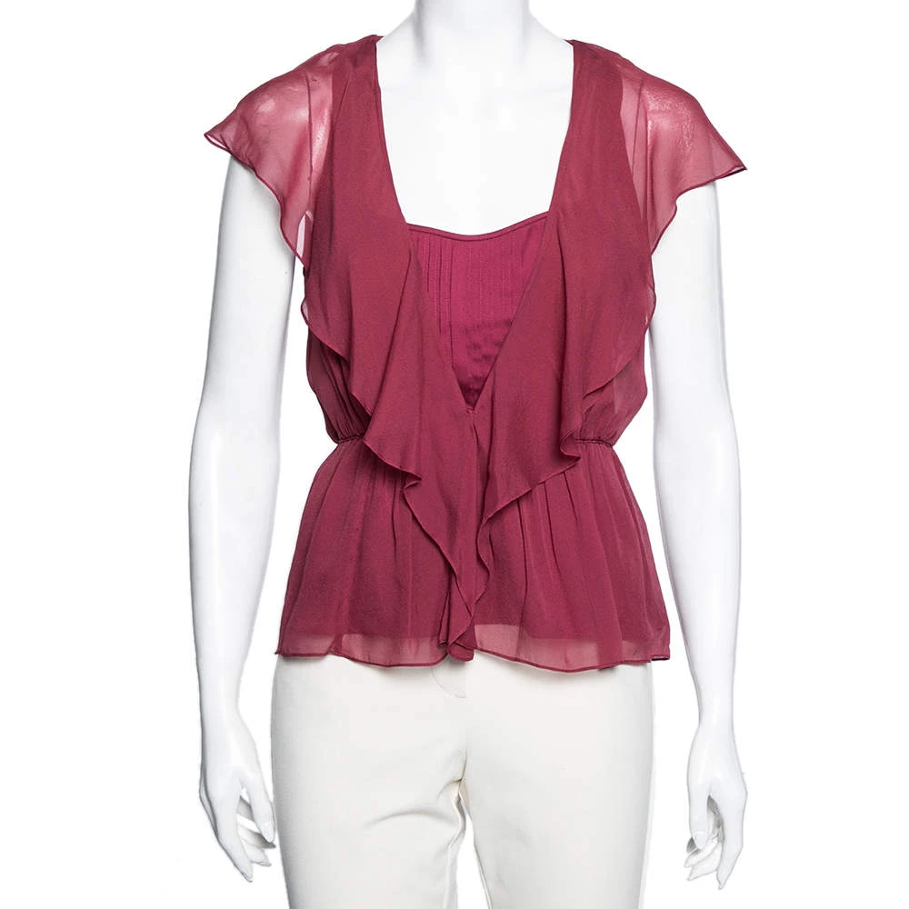 This Diane Von Furstenberg top flaunts an amazing raspberry red hue and is suitable for summer outings. It has a ruffled front and a flared hem that lends a feminine silhouette. Pair the silk top with skirts and flats for that chic appeal.