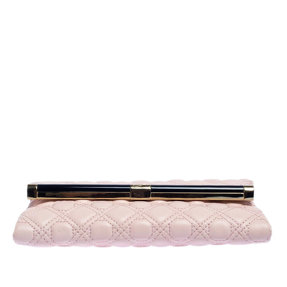 Diane Von Furstenberg yet again brings a stunning clutch that makes us marvel at its beauty and craftsmanship. Crafted from leather, it is detailed with quilts and a salmon pink shade.
