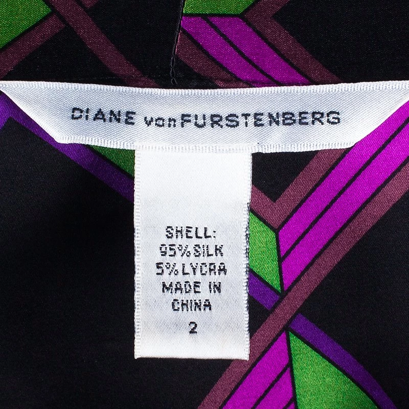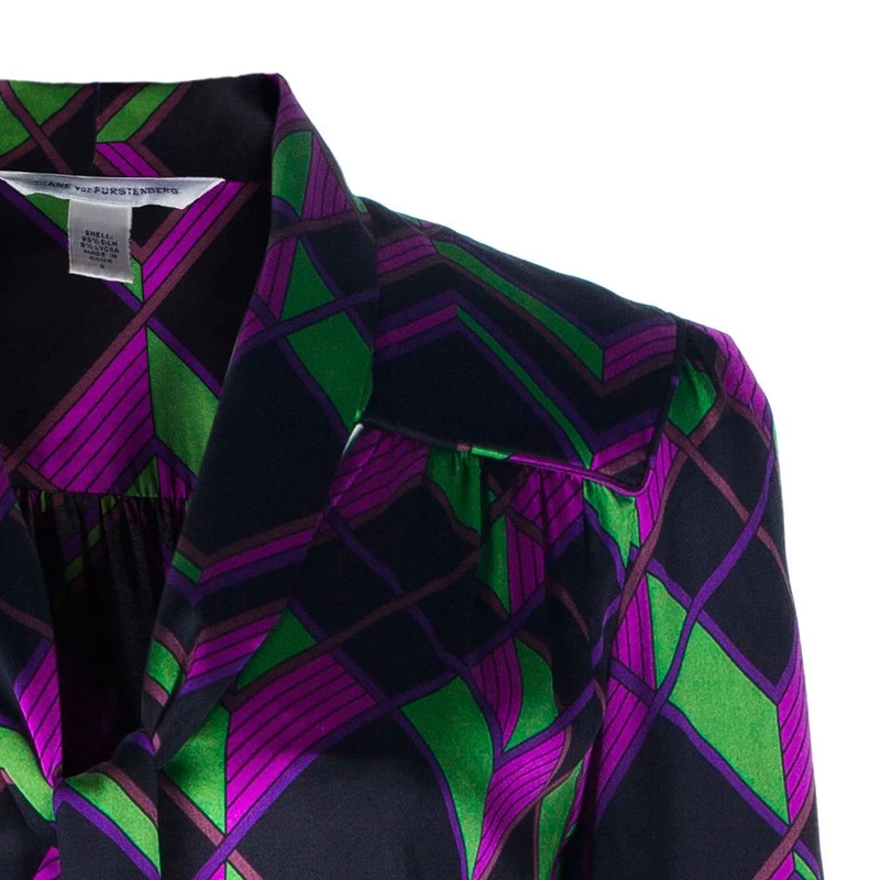 This sophisticated Diane von Furstenberg dress features a classy design and a bold print. It comes with full sleeves with cuffs and a V-neckline with tie sashes flowing down the front. It displays a relaxed fit with a knee-length hem. Made from silk in an abstract print with bold colors, the dress can be carried with contrasting clutch and pumps. This dress is from the 2006 RTW collection.