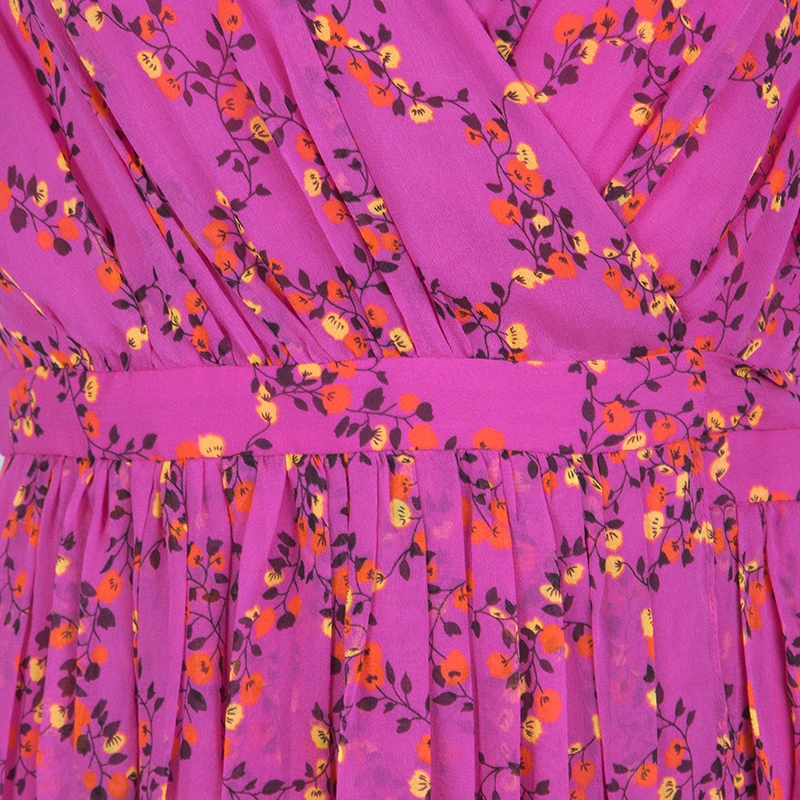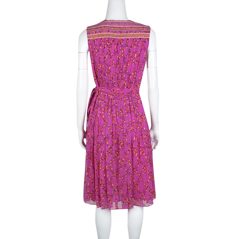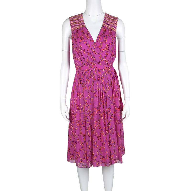 Beautiful to look at, this wrap dress from Diane Von Furstenberg is best suited for a fashionable outing. This dress is made of quality silk and it is bursting with floral prints. It is cut as a sleeveless and detailed with a tie in a wrap design. Graceful and very modern, this dress can be flaunted with strappy sandals and a crossbody bag.