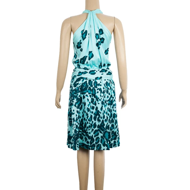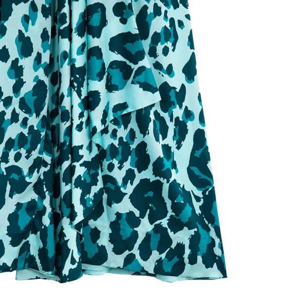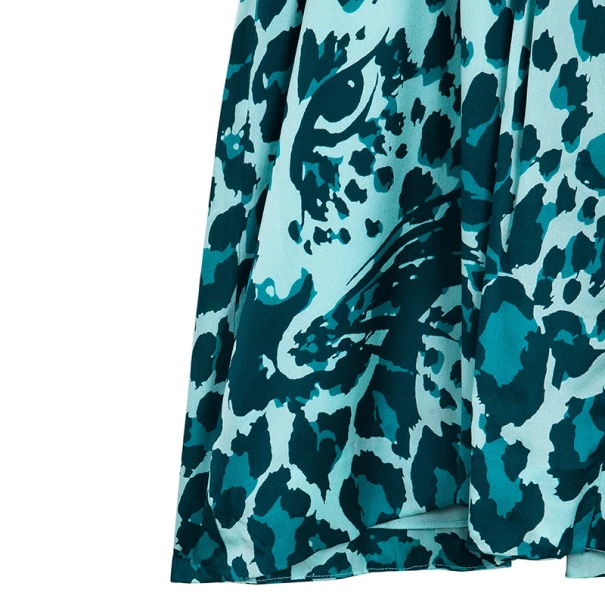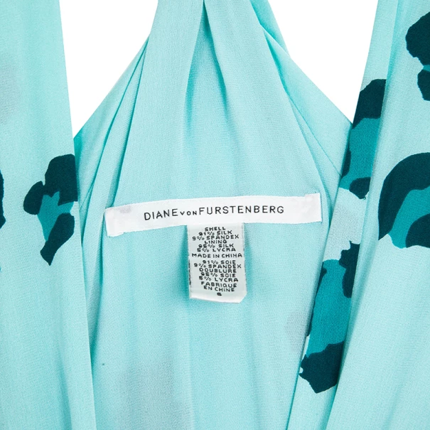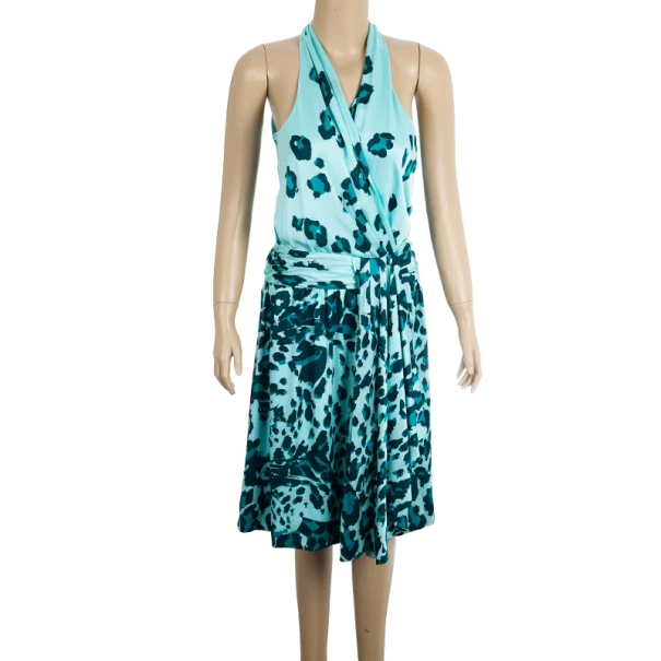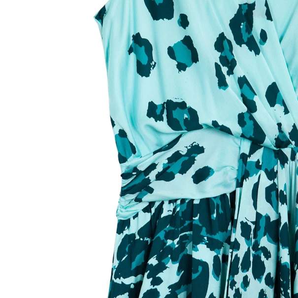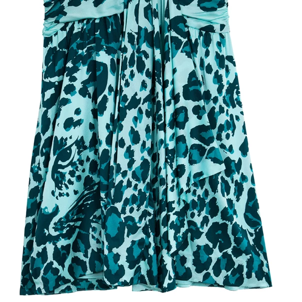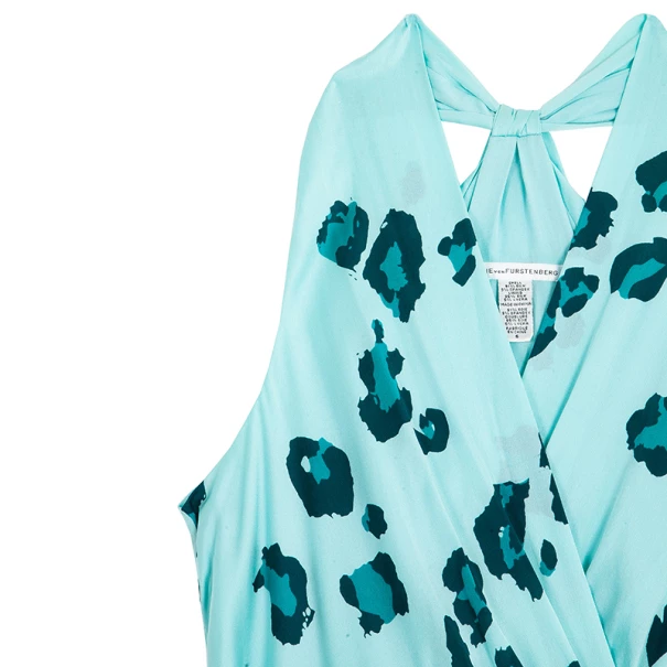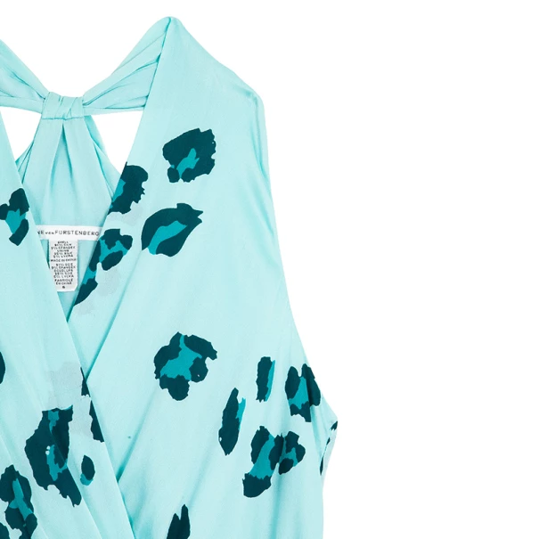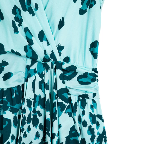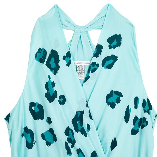 Go through the day light as a feather with this DVF dress. Its fold-over front and bright colors will cheer up your outfit. Designed with a leopardย print, it combines three shades of teal matchedย with ruching at the waist that gives it a carefree and happy tones. It has an asymmetric hemline and a surpliceย neckline with a raceback, leaving the shoulder exposed and giving the dress an summeryย look.