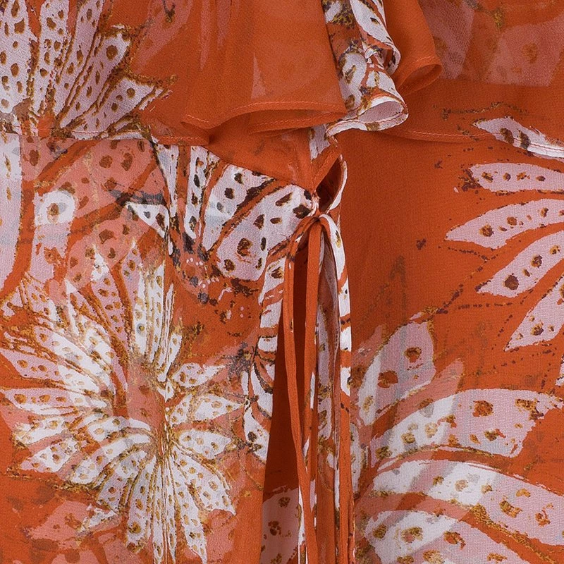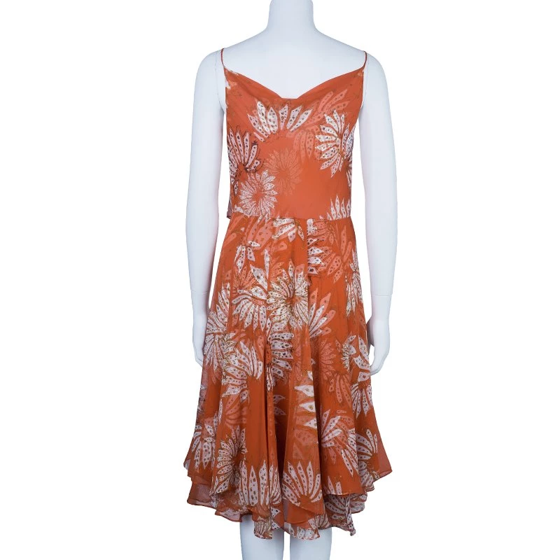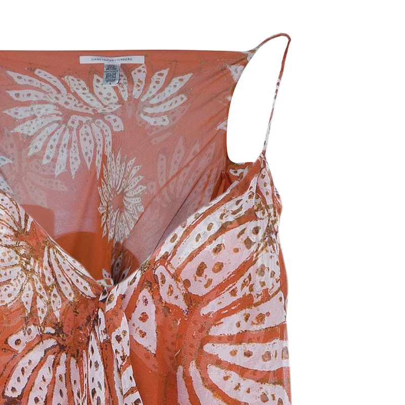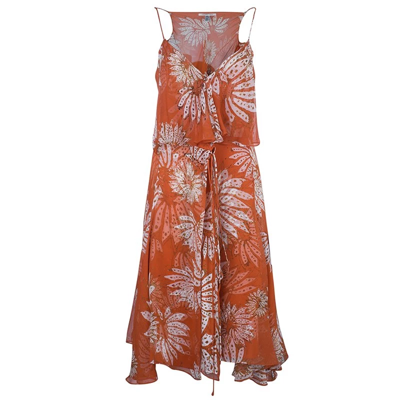 Adorable and summery is this chiffon dress from Diane Von Furstenberg. Made from silk, this Tupai dress comes in a bold orange color with white floral pattern. It is finished with a V-neckline, spaghetti straps, ribbon tie at waistline, flares at the bust and skirt and asymmetrical hem.
