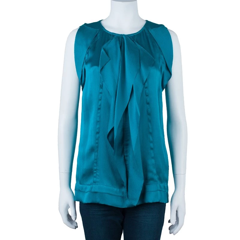 Crafted with artistic precision, this Turquoise Top from Diane Von Furstenberg Ayla collection is perfection simplified. Made from silk, its sleeveless design is coupled with a round neckline, structured pleats on the shoulders and a flared front. The hip length top comes with a back button and key hole closure that adds a touch of class.