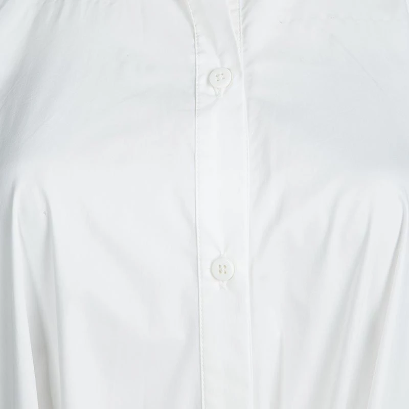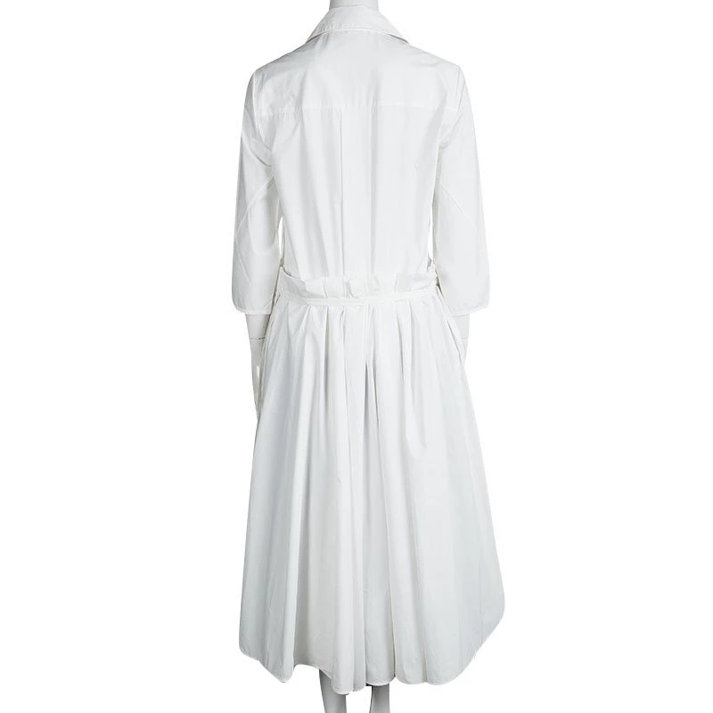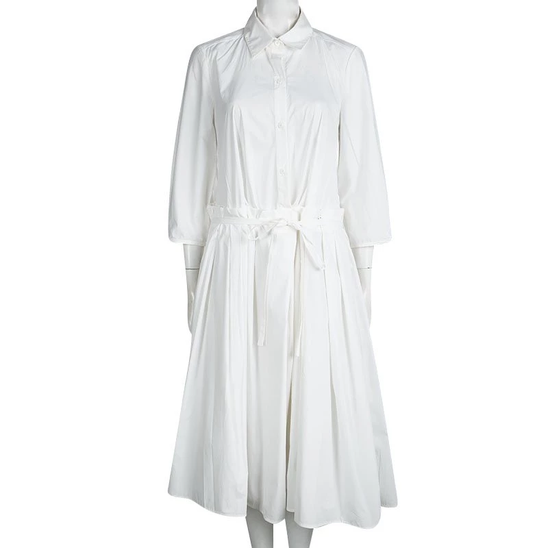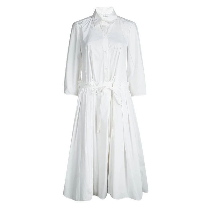 This Cynthia dress from the New-York based designer is cut from an ultra-soft white cotton poplin. It comes with a shirt style upper half of the body and a pleated skirt that extends to a midi length. It is secured with a tie-up waistline and comes with quarter sleeves. Wear this chic dress with slides and a cool pair of sunglasses for a day outing with friends.