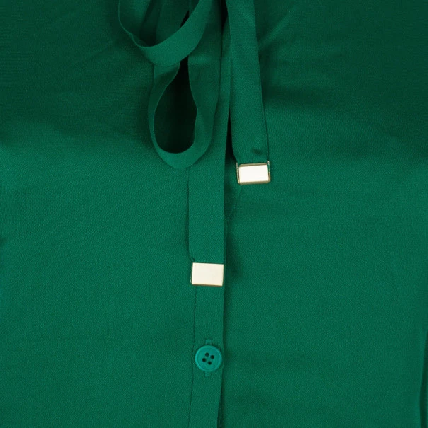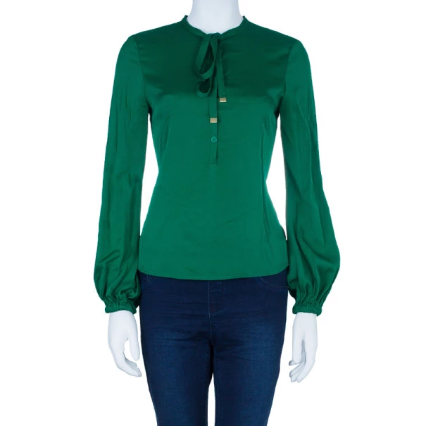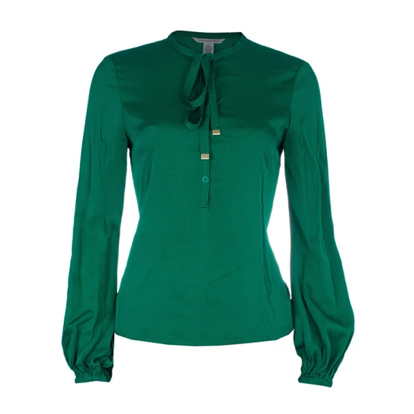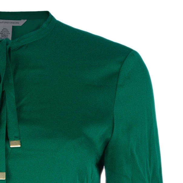 Walk with pride as you sport this chic and feminine piece of clothing from Diane von Furstenberg. Made from quality silk, this soft and slightly stretchable top features a round neck with strings accentuated with silver-tone hardware edges. The elasticized cuffs and curved hem at the back add the finishing touches.Original Retail Price: US $245