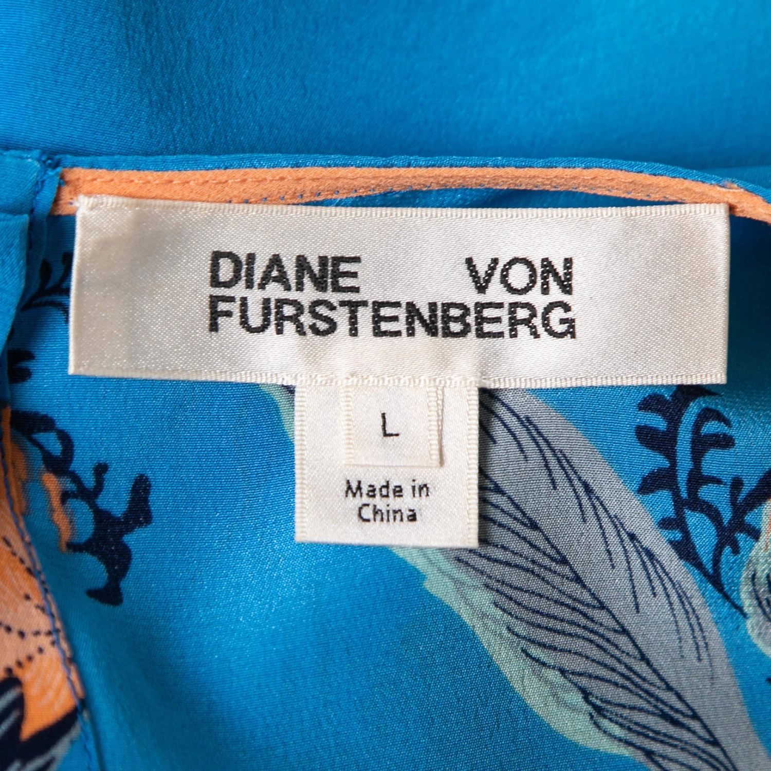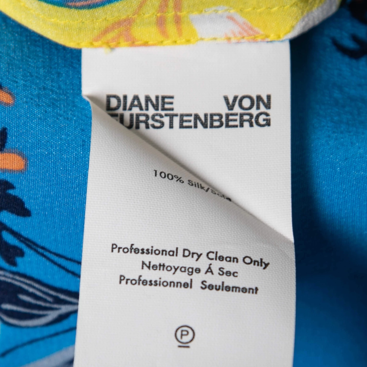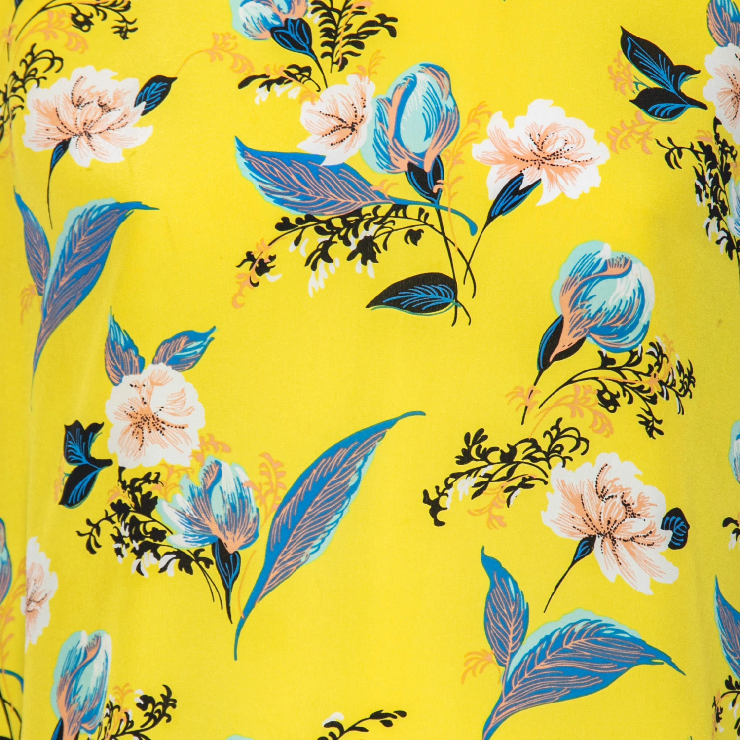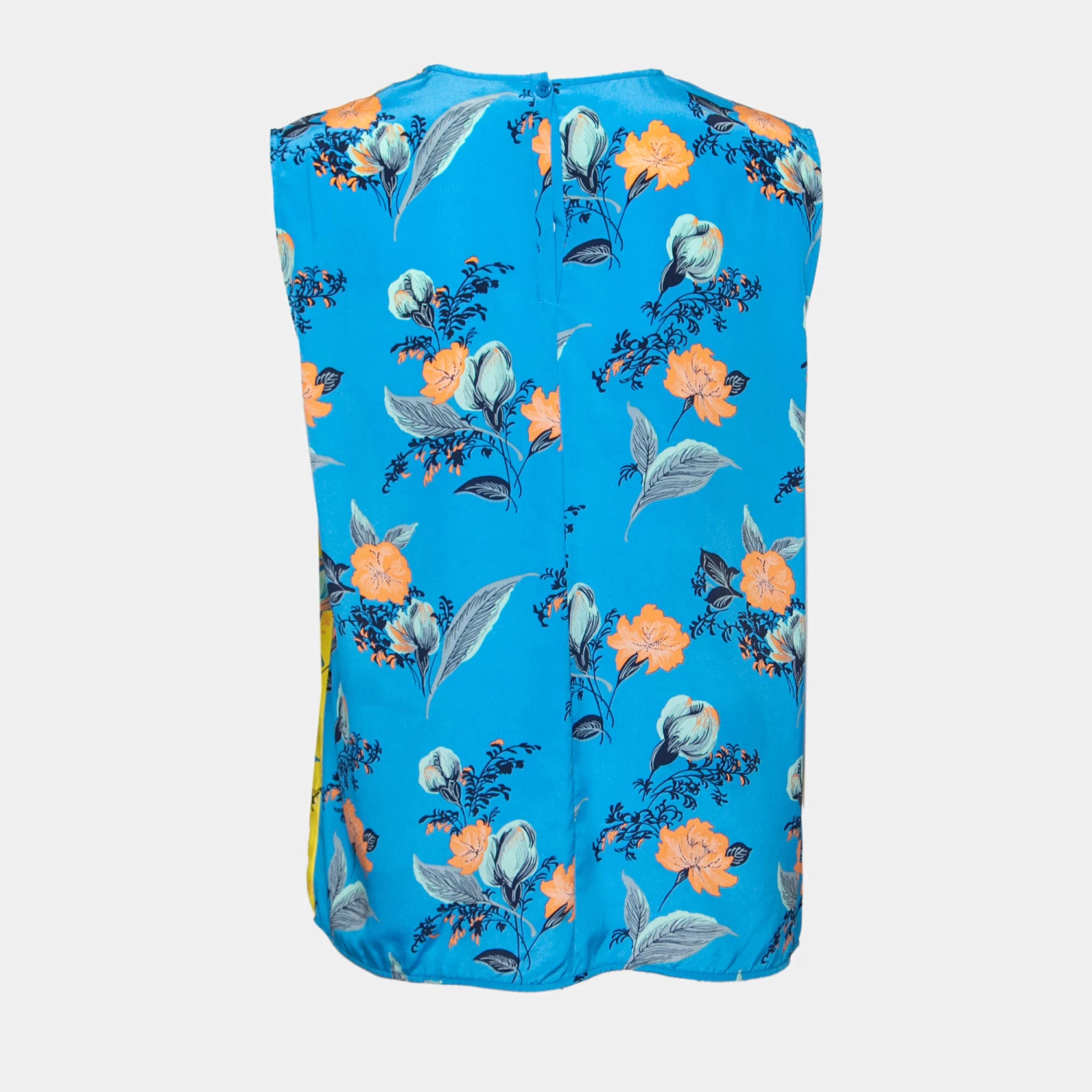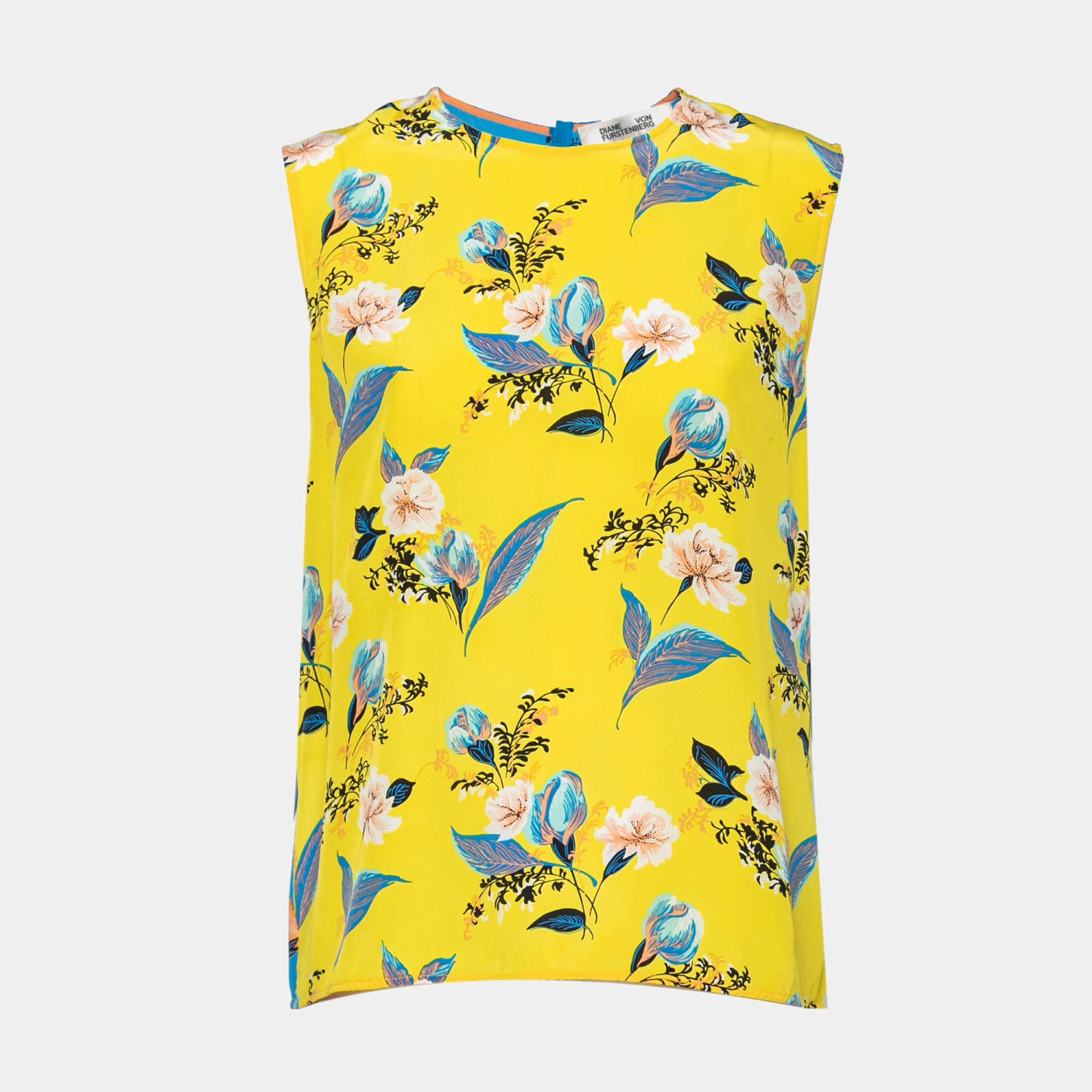 Pretty in floral designs, this top from Diane von Furstenberg is all about flaunting elegance and poise in the summer. It is tailored using yellow-blue floral printed silk fabric and shows a sleeveless style.
